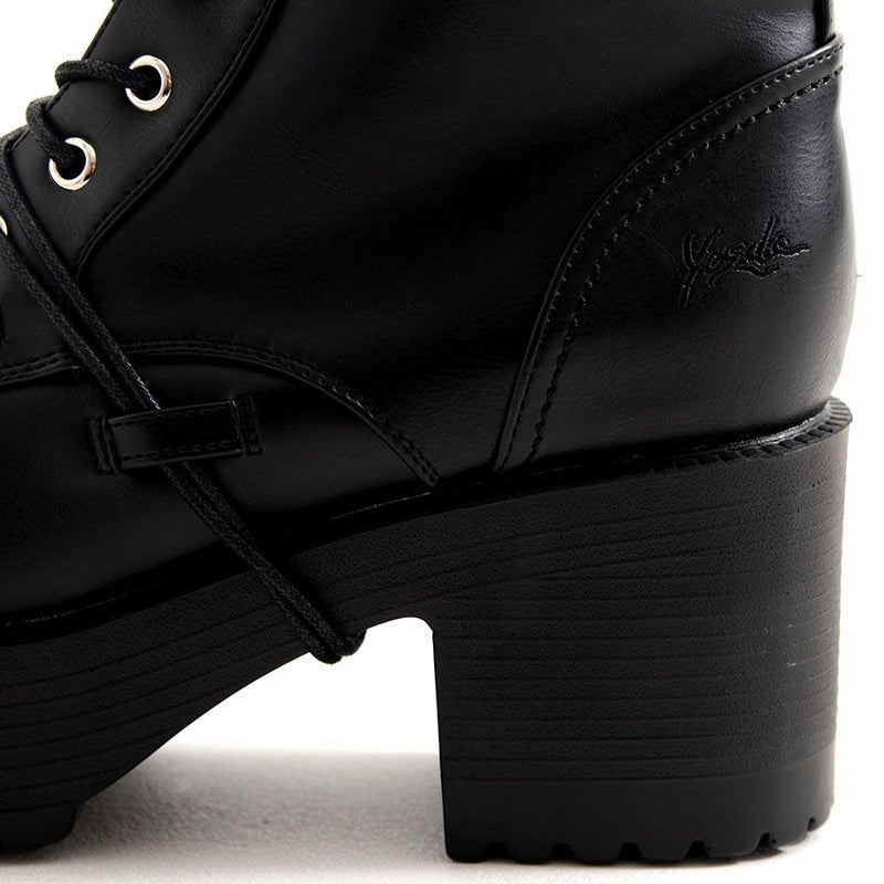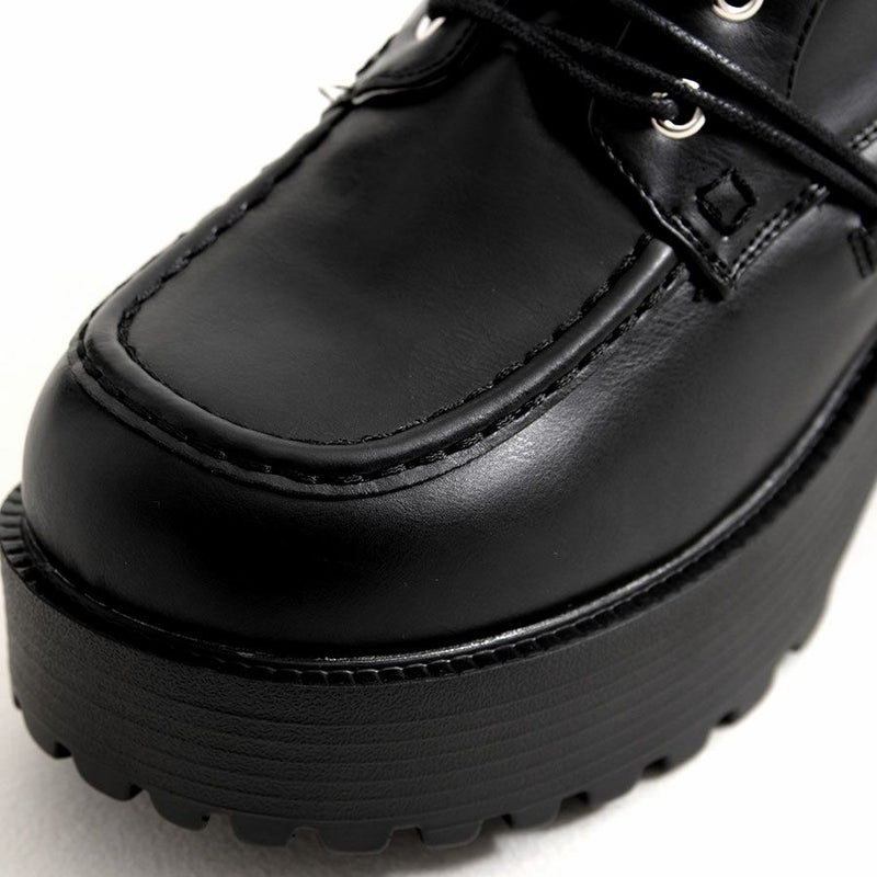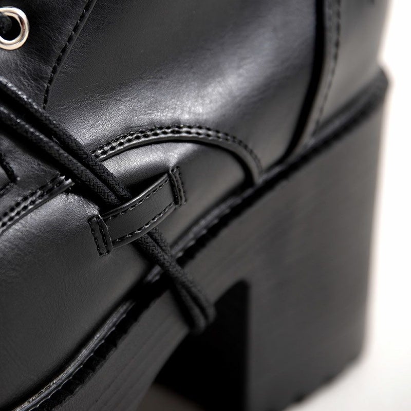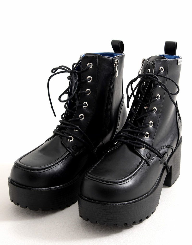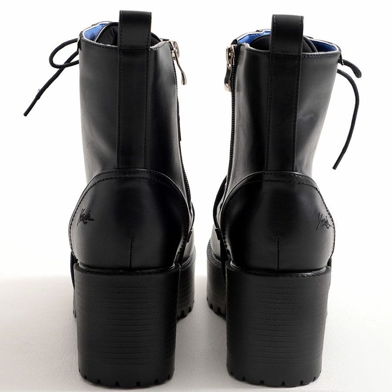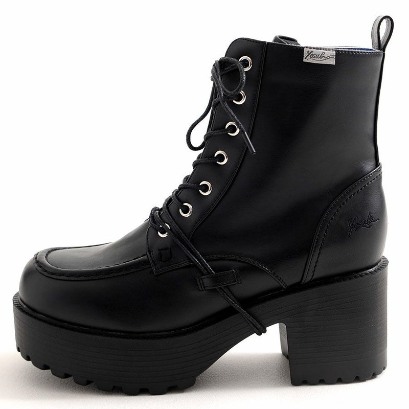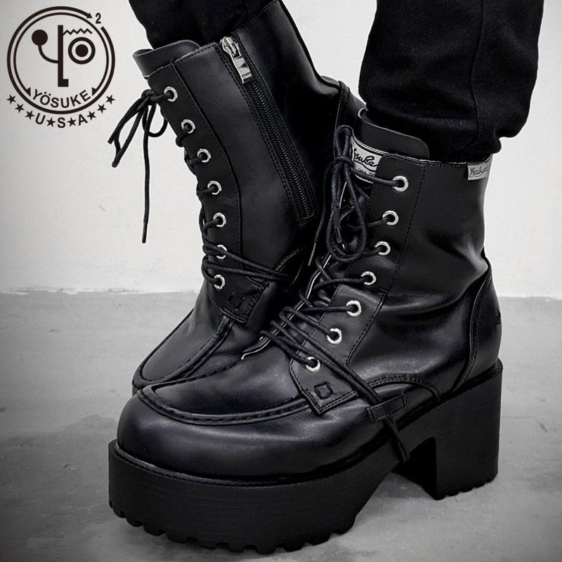 YOSUKEからメンズ紐巻きレースアップブーツが入荷。 軽量なのに存在感のあるソールで、歩きやすさもデザイン性も兼ね備えた厚底ブーツ。 変形ヒモ通しのYOSUKEらしいデザインです。 内側ジッパーでサッと脱ぎ履き出来るのも嬉しいポイント。 地雷系スタイルやV系スタイルまで幅広く活躍してくれます。 同デザインのより厚底なタイプもあります。