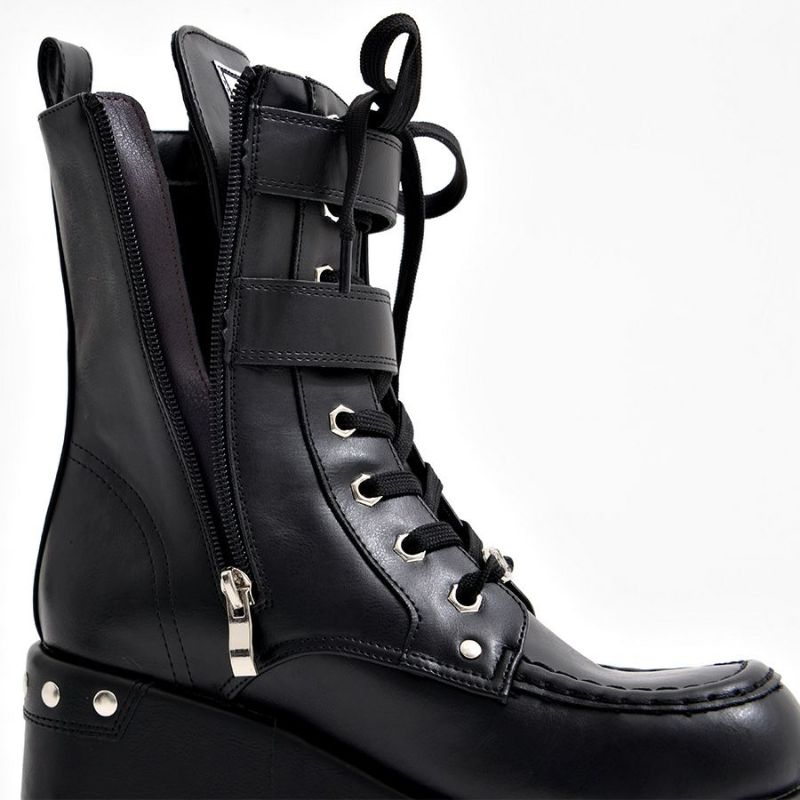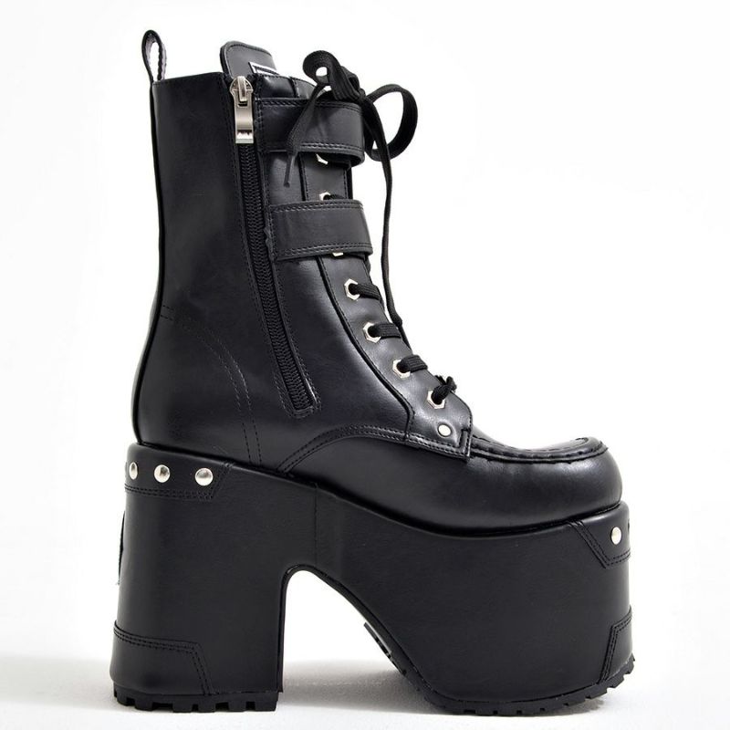 厚底ソールにベルトデザインやスタッズを配置した存在感抜群のブーツ。