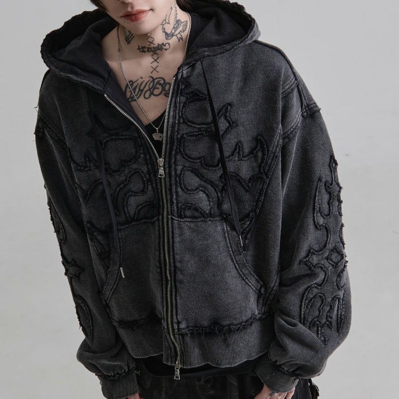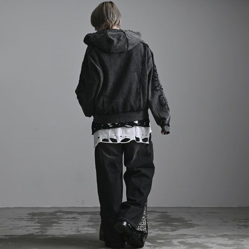 ほつれ加工を施したようなトライバルデザインアップリケをフロントと両腕に配置。