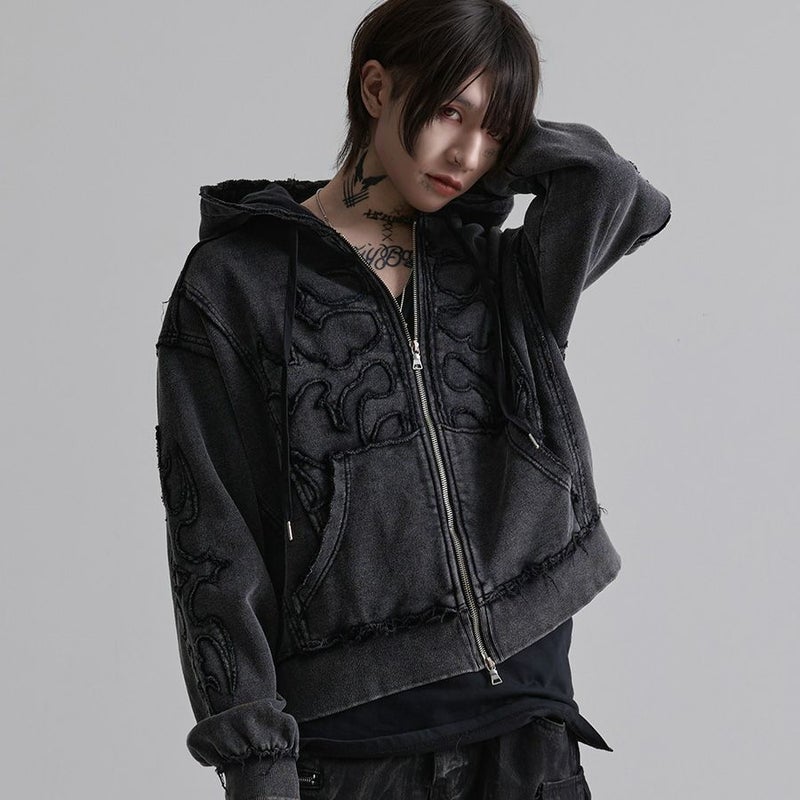 ケミカルブリーチ加工を施して奥行のあるヴィンテージ感を演出したムラ感のある短丈ジップアップパーカーです。