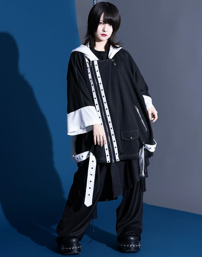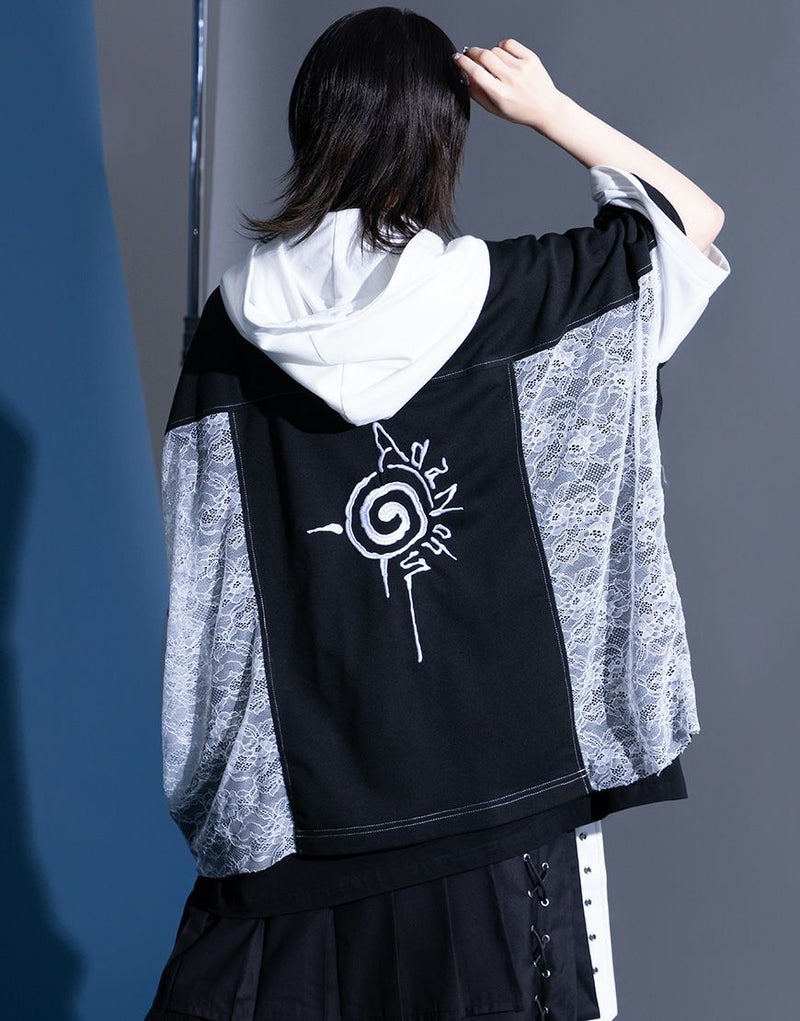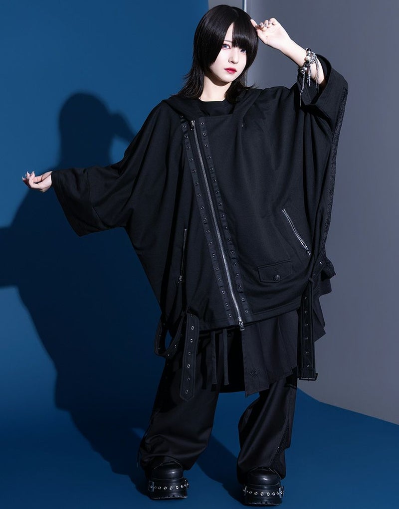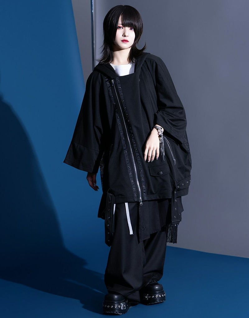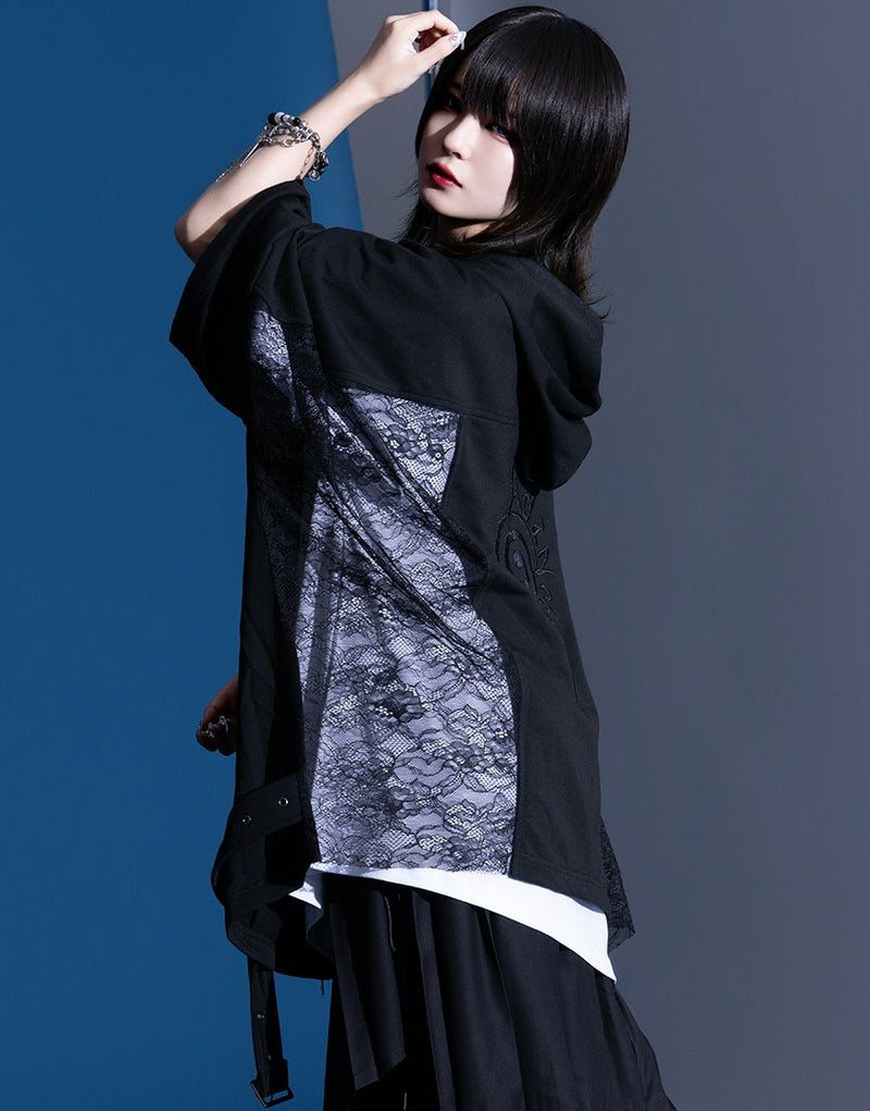 象徴的なアシンメトリーのZIPラインはそのままに、エンブレムボタンへの変更、背面の刺繍グラフィックを一新し、サイドの別布には儚げなレース素材を採用。