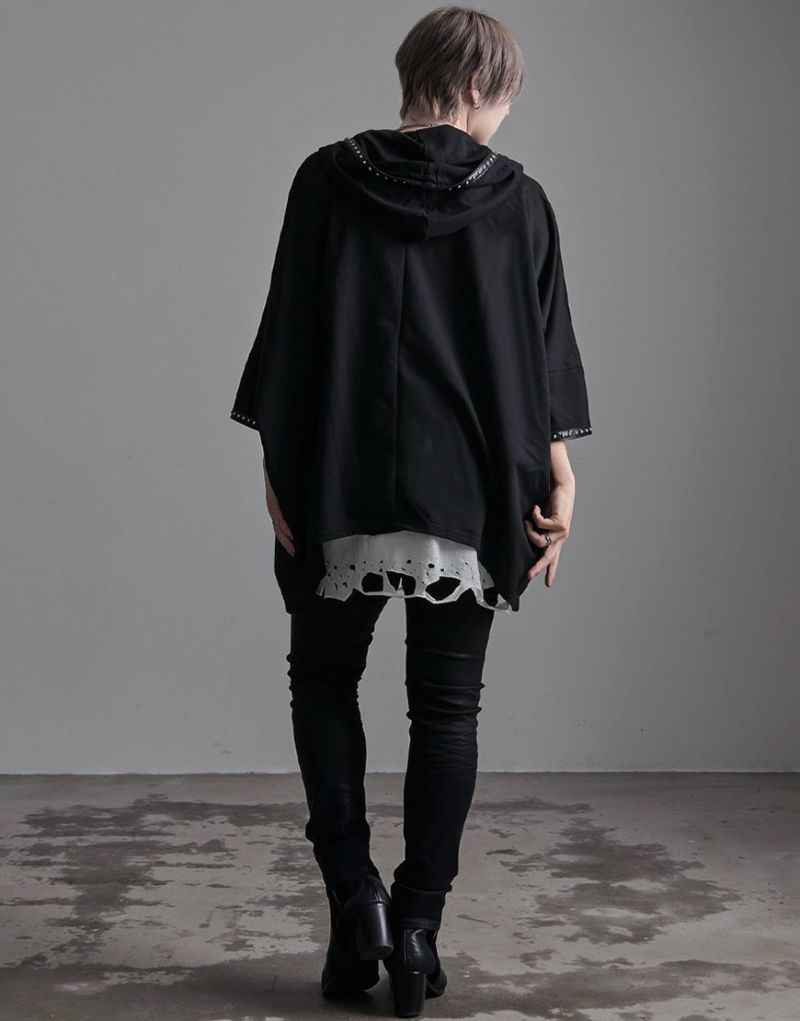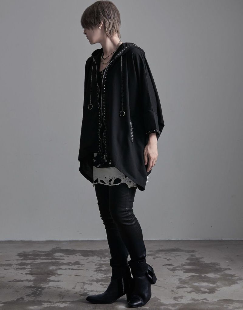 特徴的なポンチョシルエットになっており首元には手錠のようなデザインチェーンを配置した細かいディテールまで拘った存在感溢れるヴィジュアル。