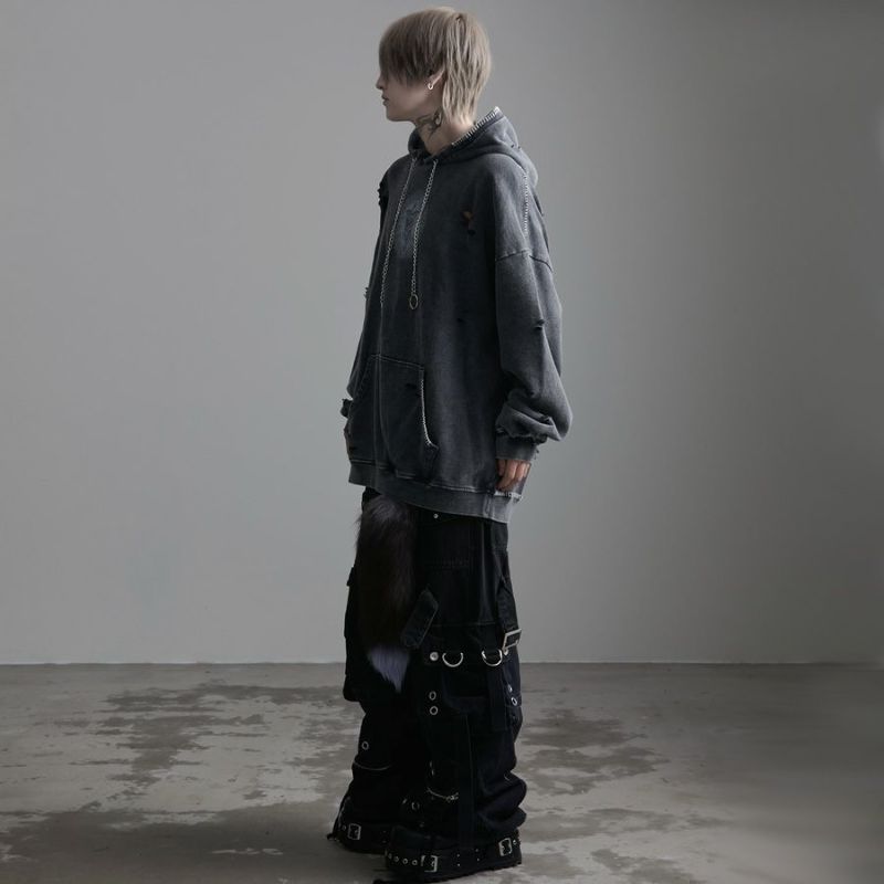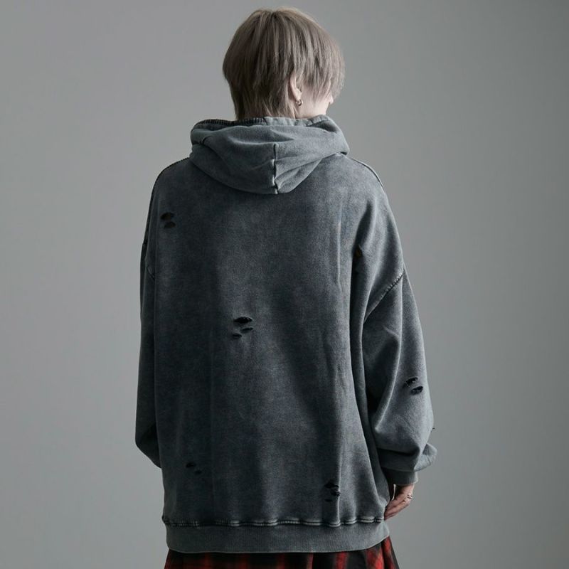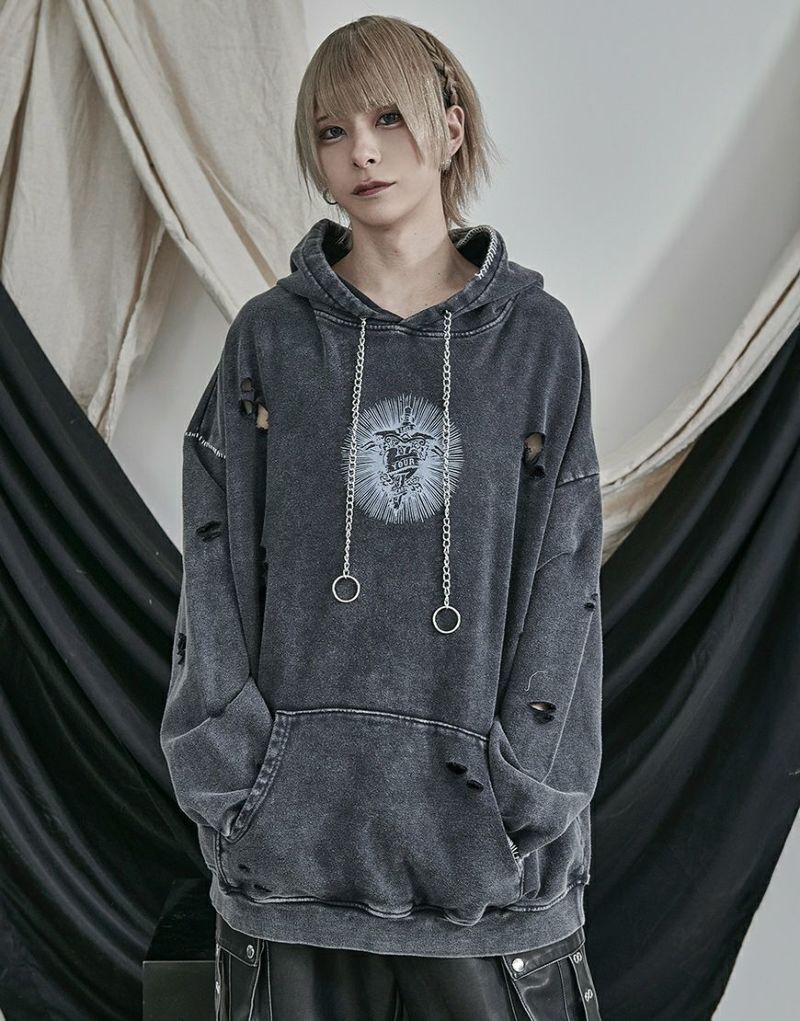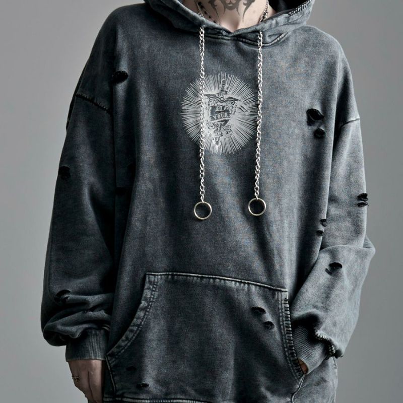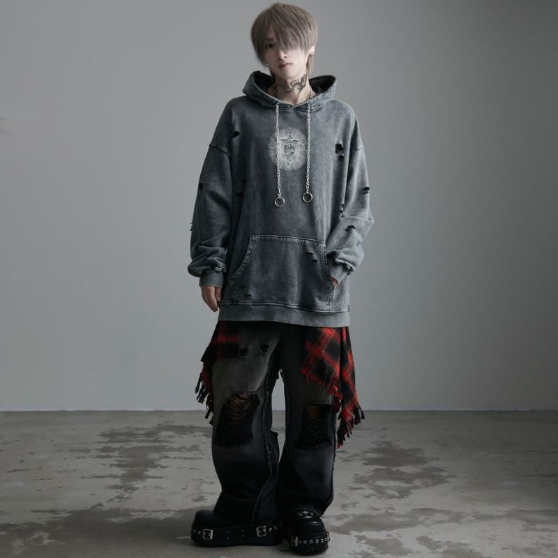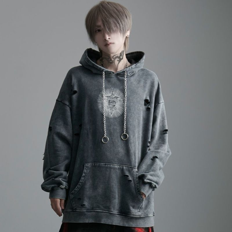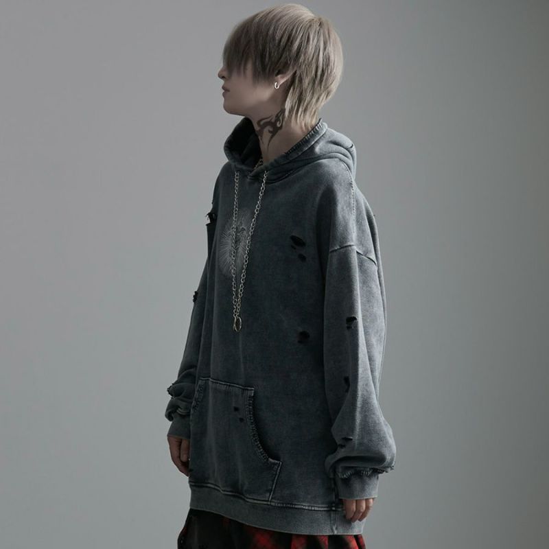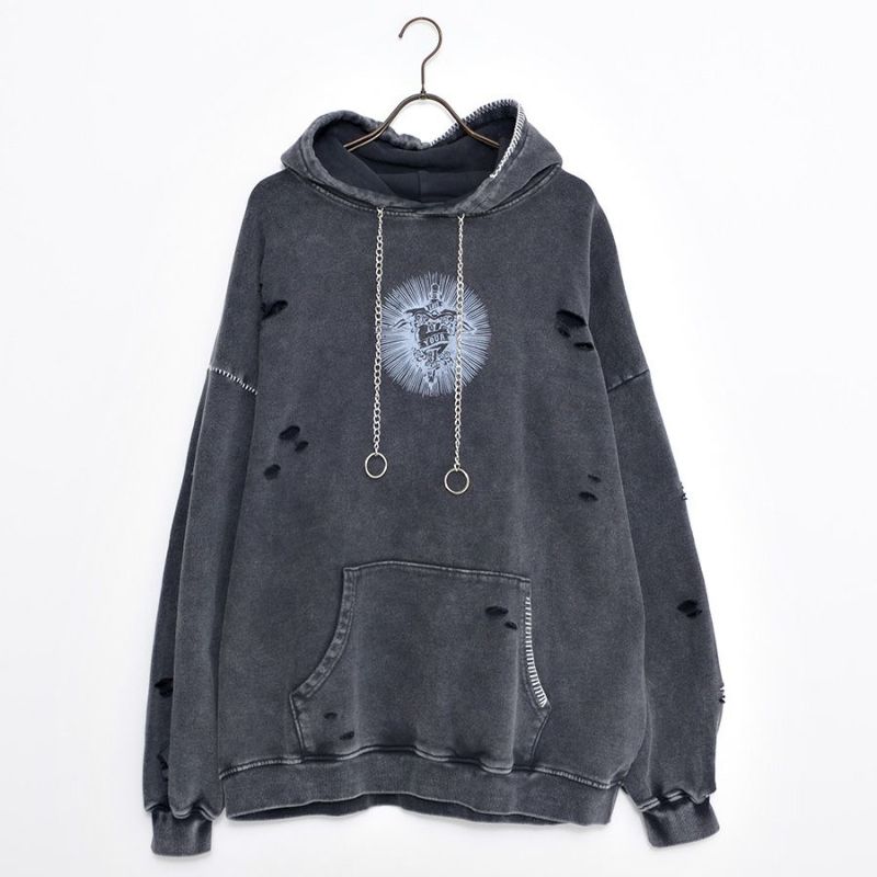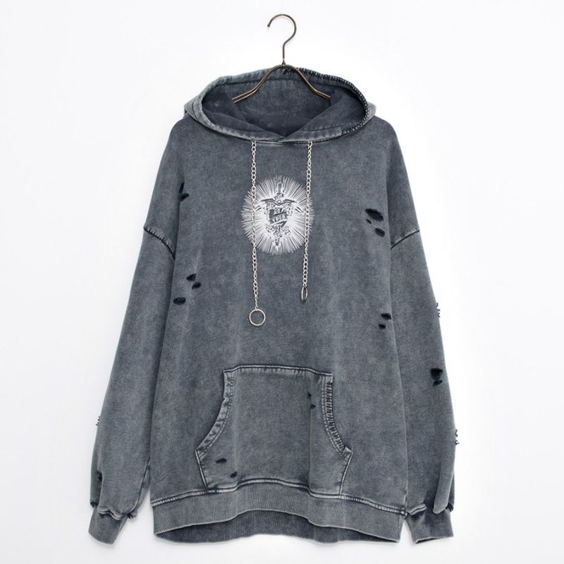 ililil【イルイルイル】よりlost your heartクラッシュ加工パーカーが登場です。 フロントにダガーハートグラフィックがされたプルオーバーパーカー。 所々にダメージ加工を施しヴィンテージ感を演出。ポイントでポケットや袖、フードの配色ステッチデザインと更にドローコードのリングチェーンがアクセントに。 ビッグシルエットでメンズ、レディースを問わず、ユニセックスでご着用頂ける一押しパーカーです。