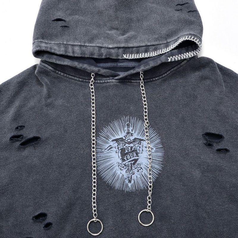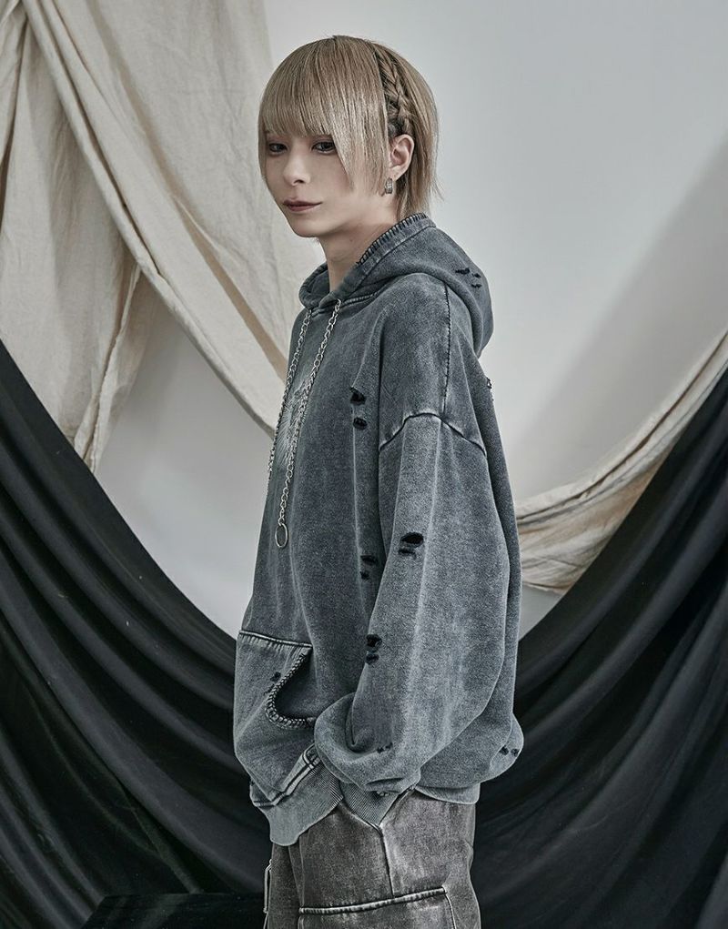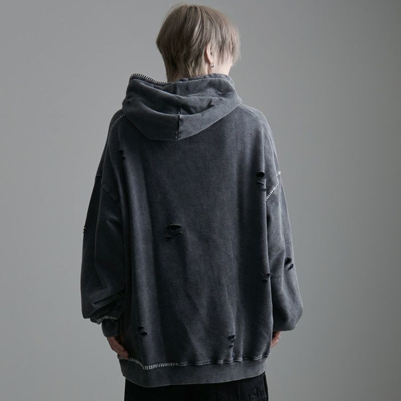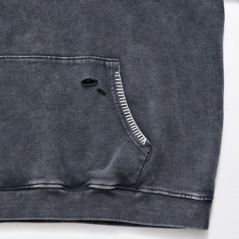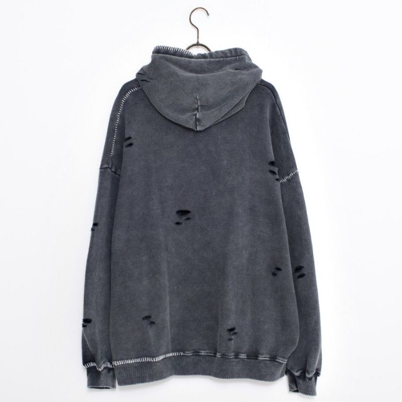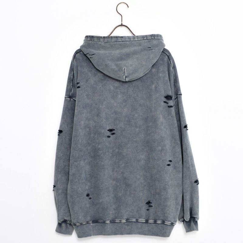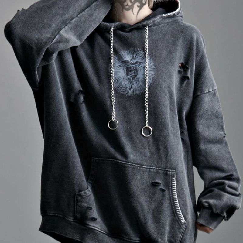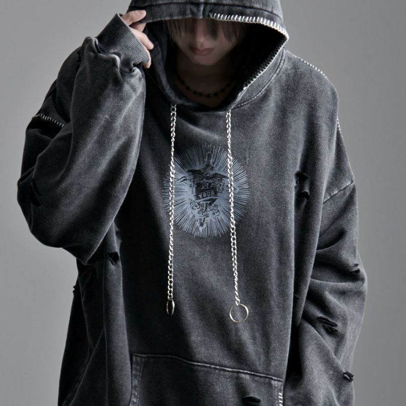 ililil【イルイルイル】よりlost your heartクラッシュ加工パーカーが登場です。 フロントにダガーハートグラフィックがされたプルオーバーパーカー。 所々にダメージ加工を施しヴィンテージ感を演出。ポイントでポケットや袖、フードの配色ステッチデザインと更にドローコードのリングチェーンがアクセントに。 ビッグシルエットでメンズ、レディースを問わず、ユニセックスでご着用頂ける一押しパーカーです。