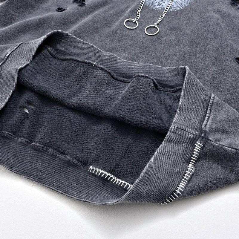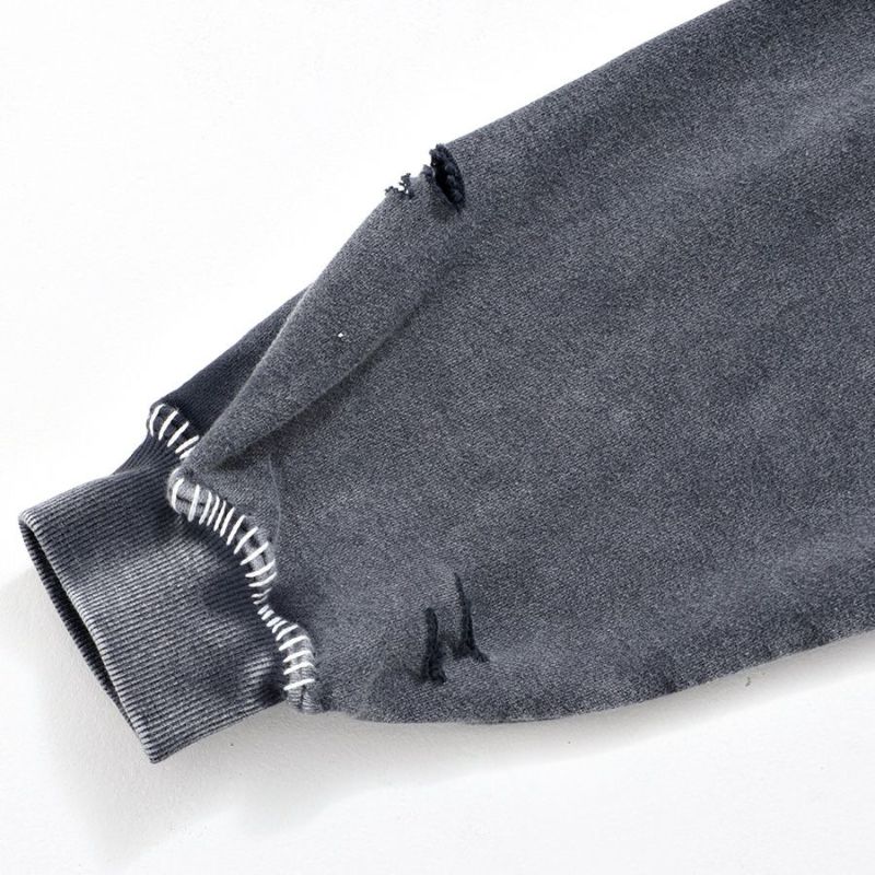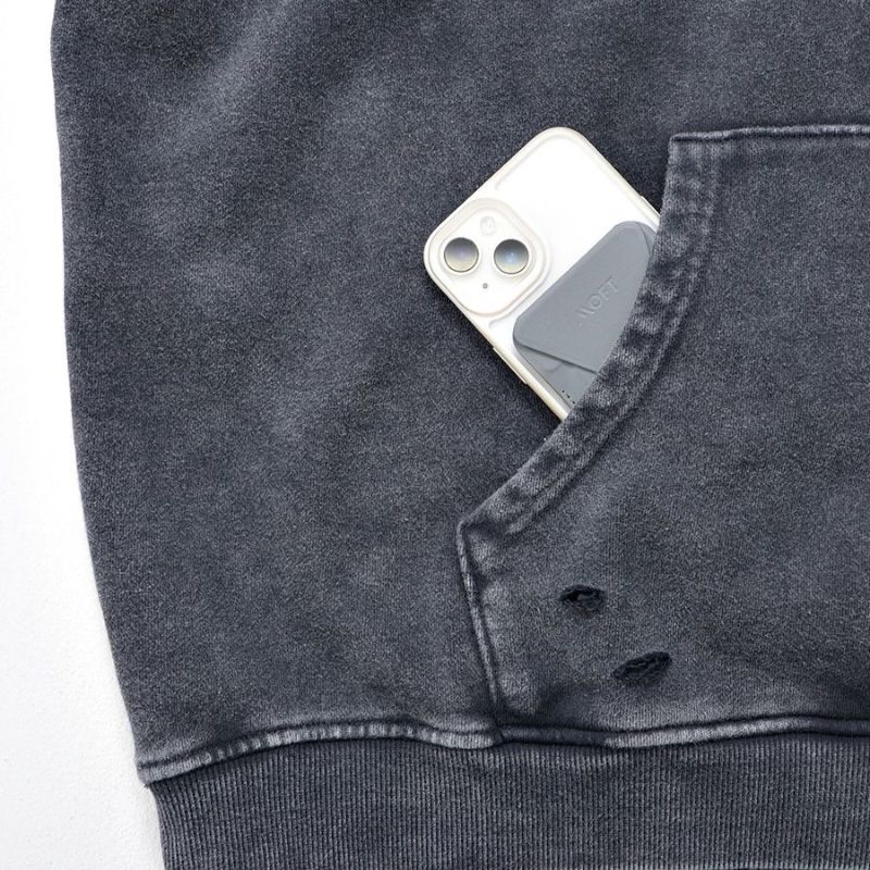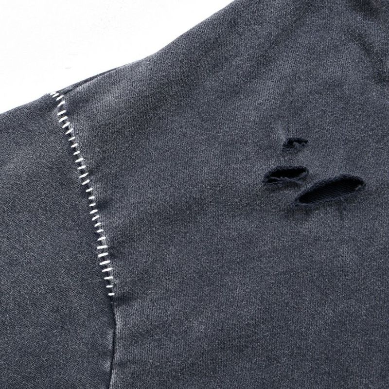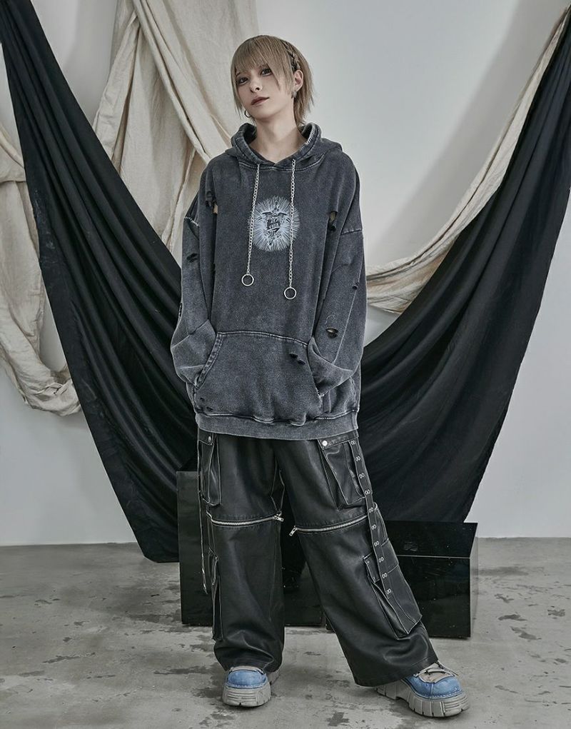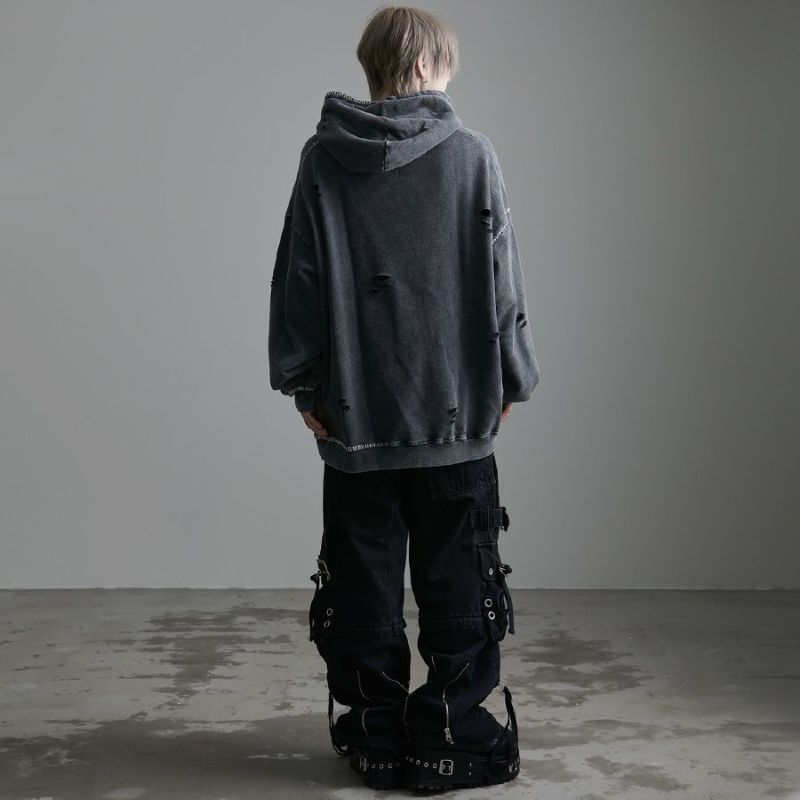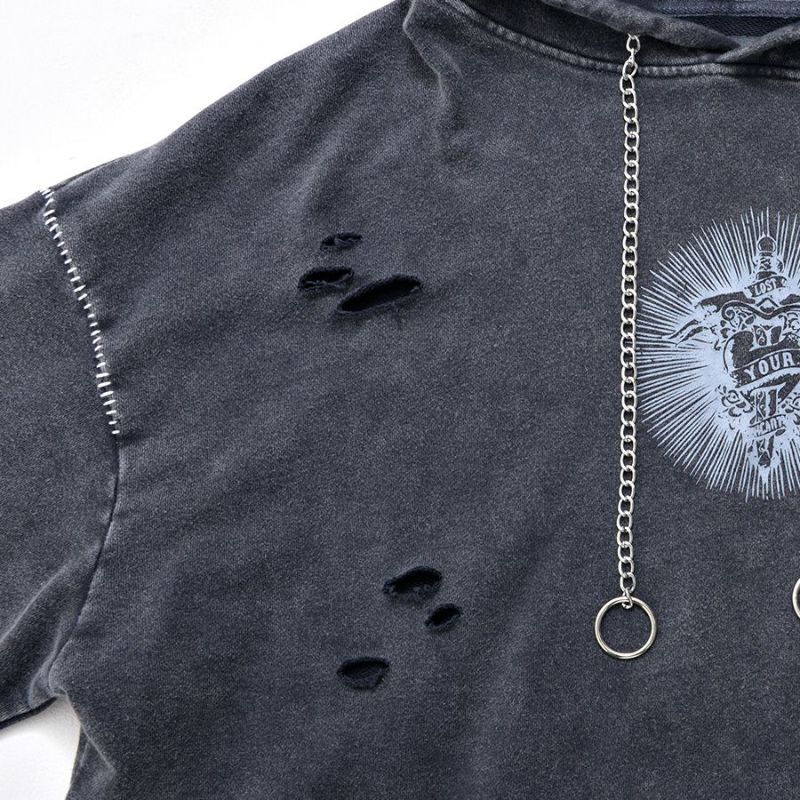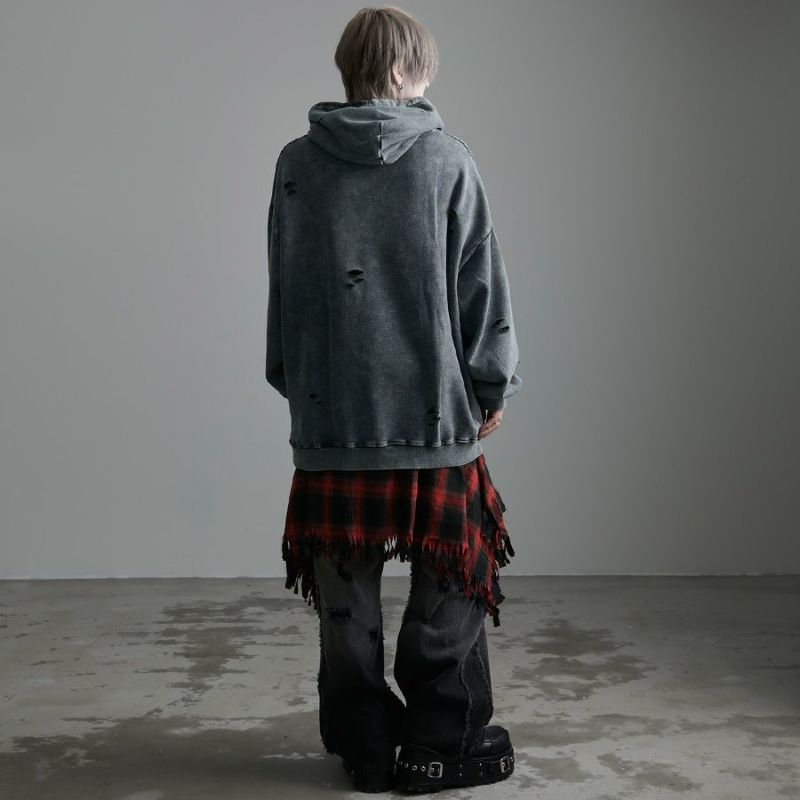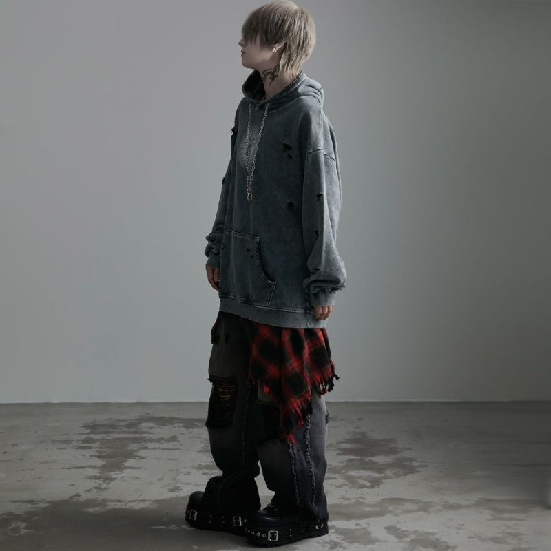 ililil【イルイルイル】よりlost your heartクラッシュ加工パーカーが登場です。 フロントにダガーハートグラフィックがされたプルオーバーパーカー。 所々にダメージ加工を施しヴィンテージ感を演出。ポイントでポケットや袖、フードの配色ステッチデザインと更にドローコードのリングチェーンがアクセントに。 ビッグシルエットでメンズ、レディースを問わず、ユニセックスでご着用頂ける一押しパーカーです。