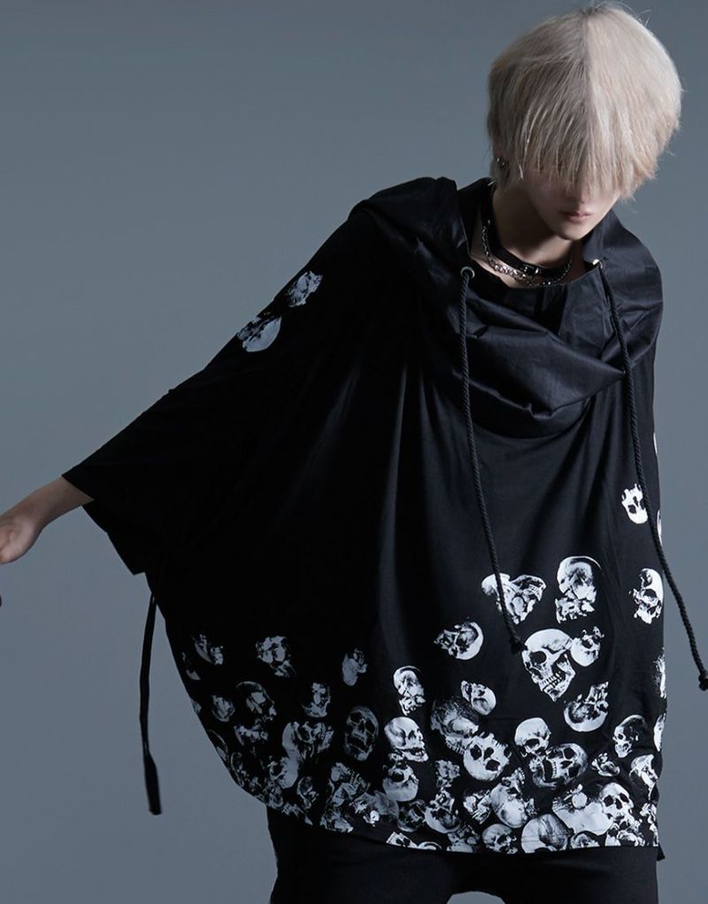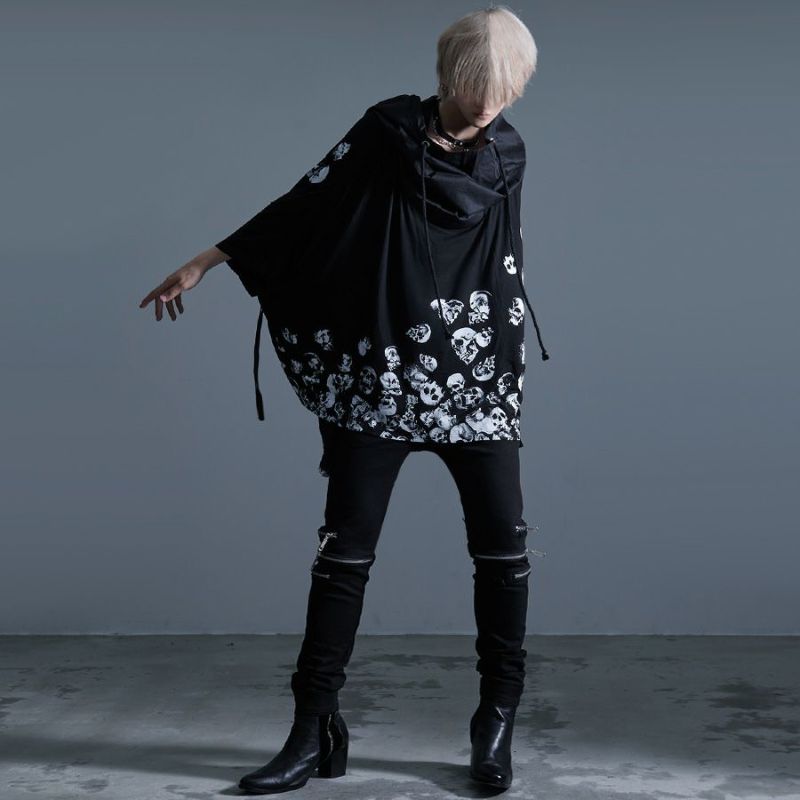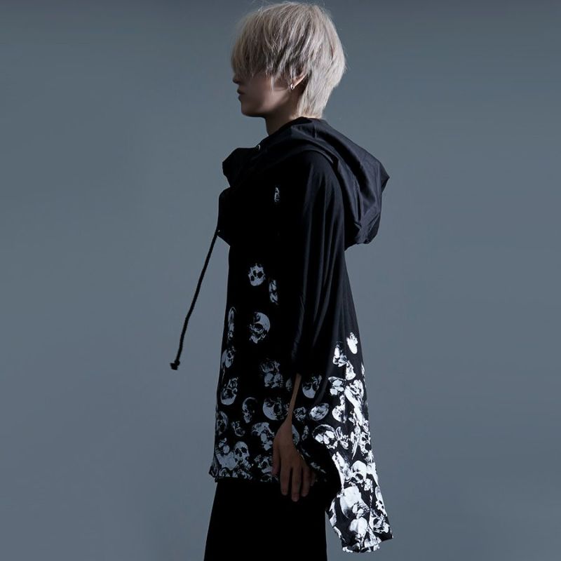 舞い散るようにスカルが総柄で描かれたボディは滑らかで動きの出る素材を用いてたっぷりと身幅をとったモードなシルエット。