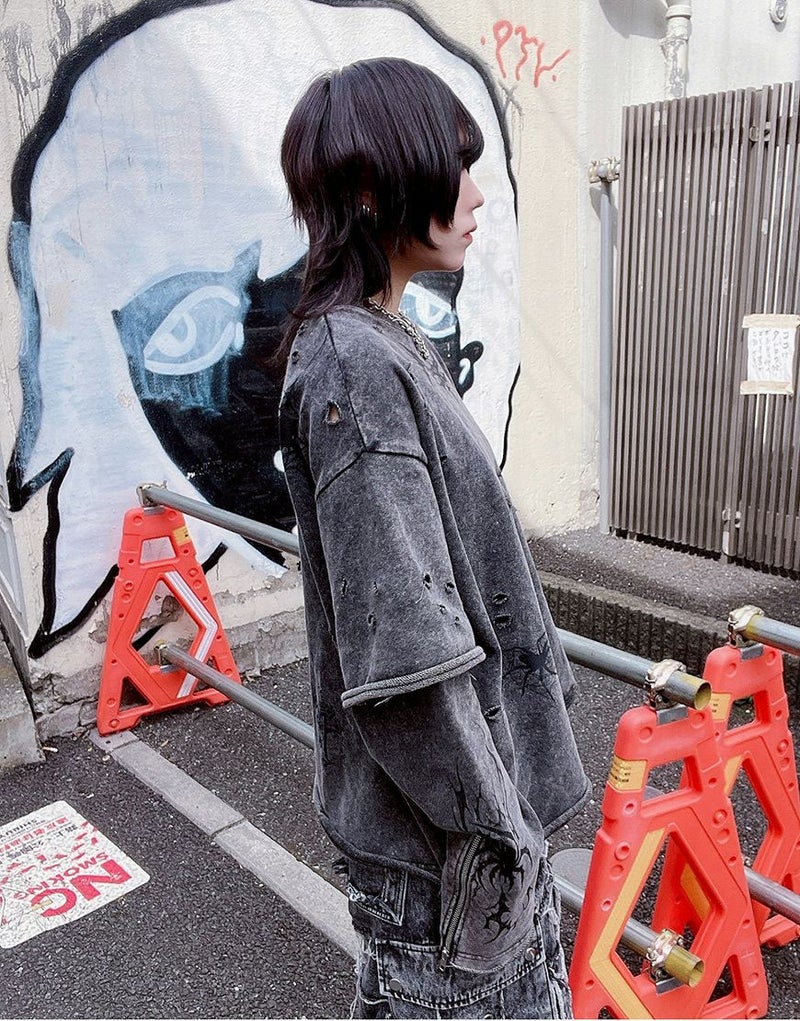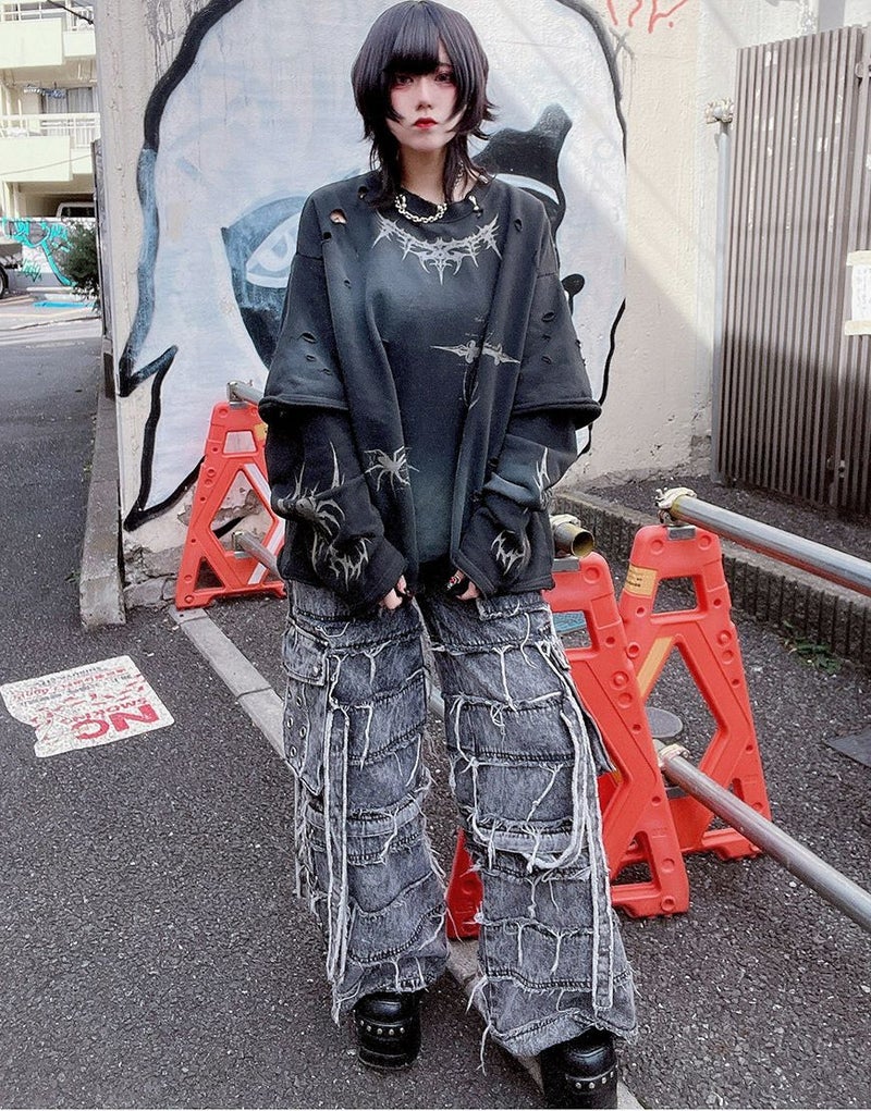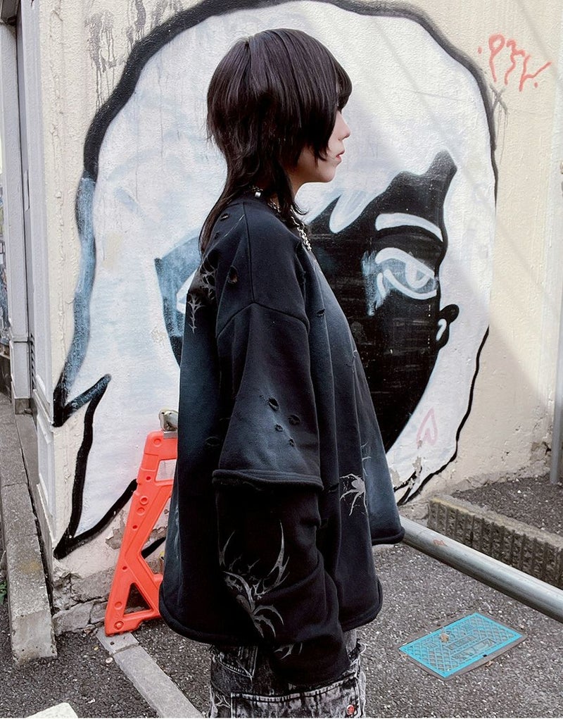 オーバーシルエットでユニセックスに着用でき、地雷・モード・グランジスタイルまで幅広く対応可能。