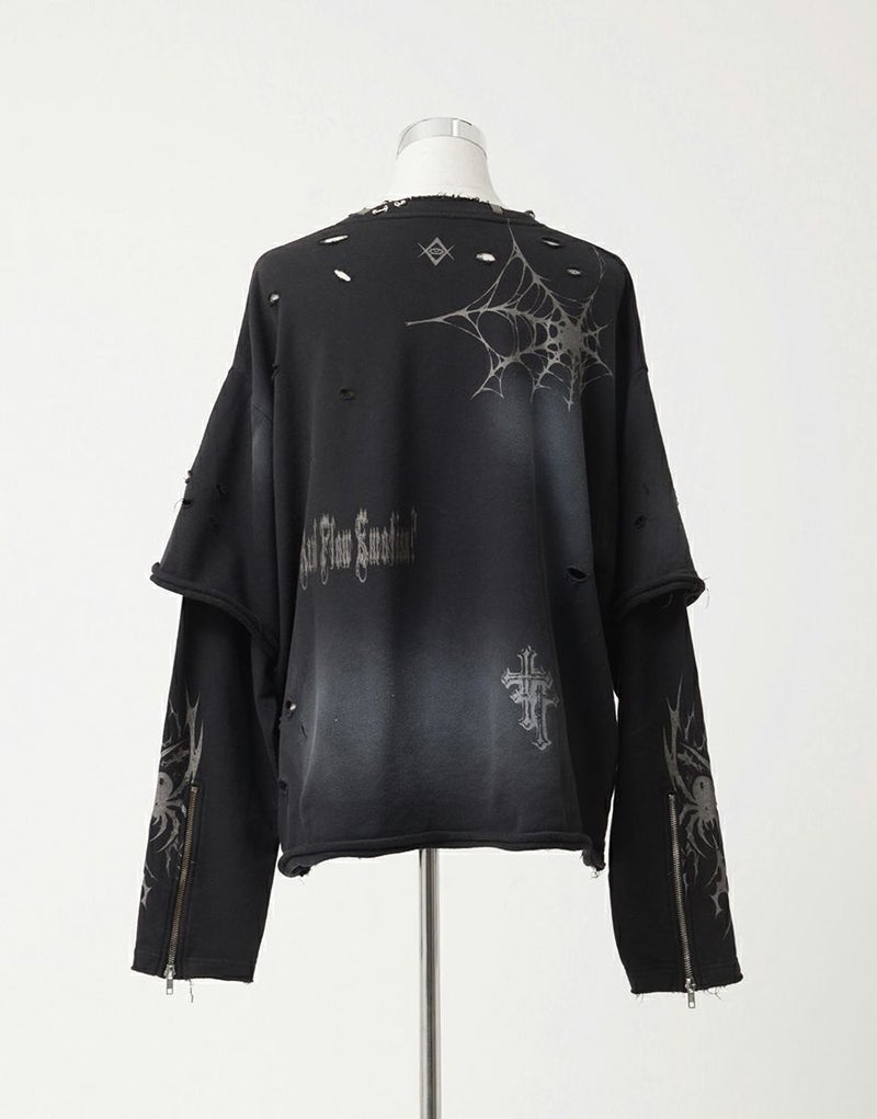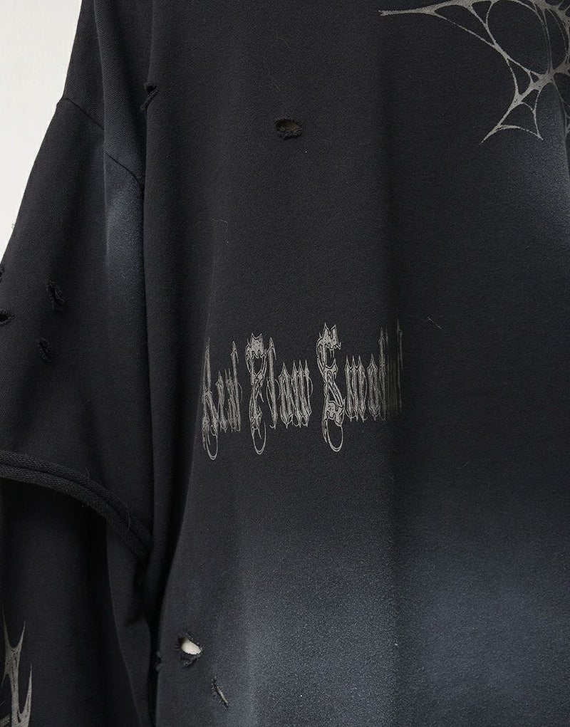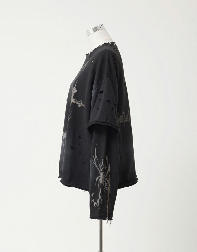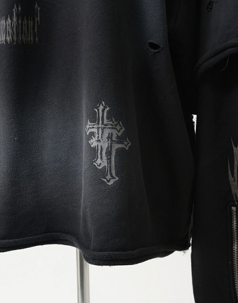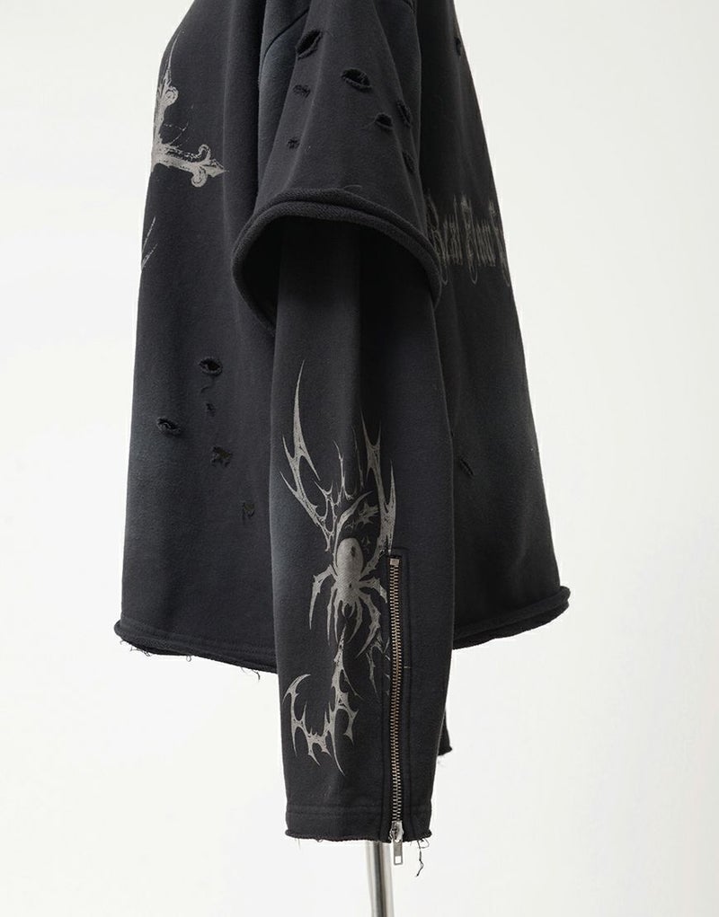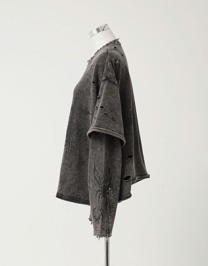 裏毛素材をベースに、各所に断ち切りディテールとダメージ加工を施した、グランジ感あふれる一着。