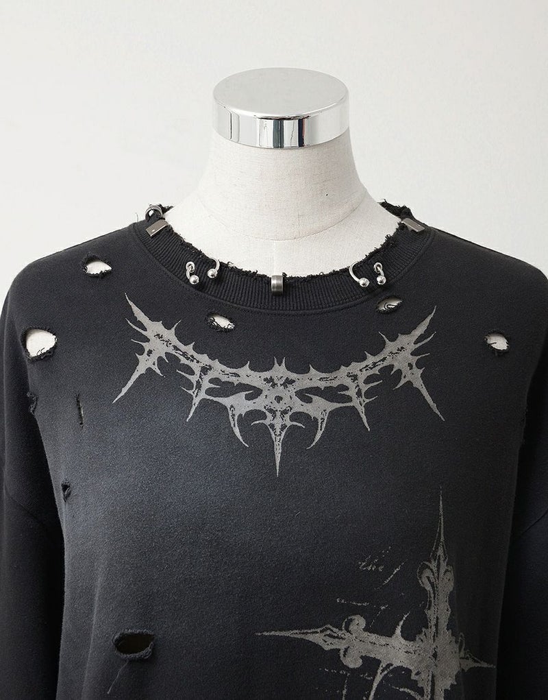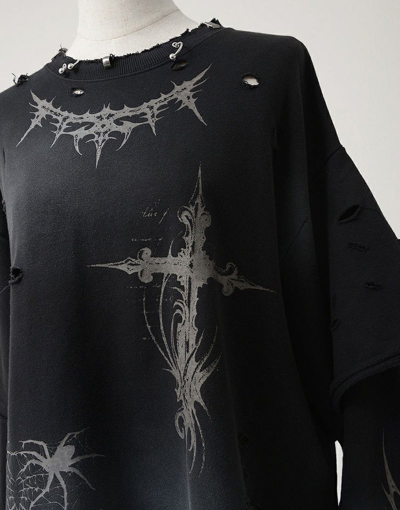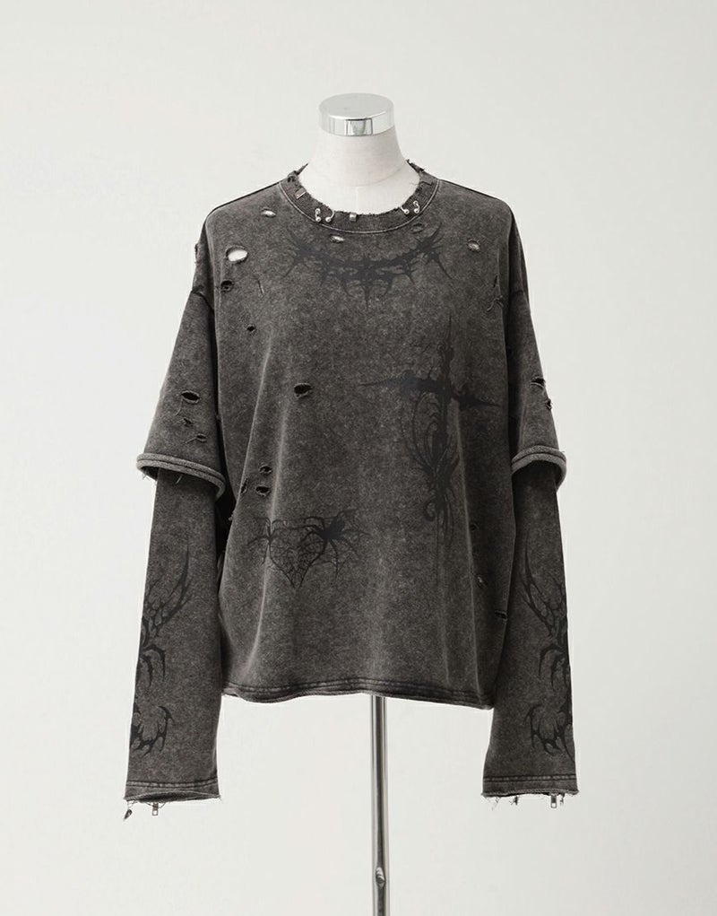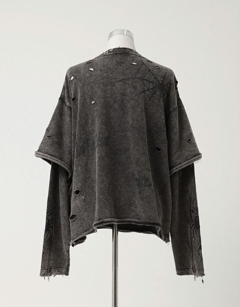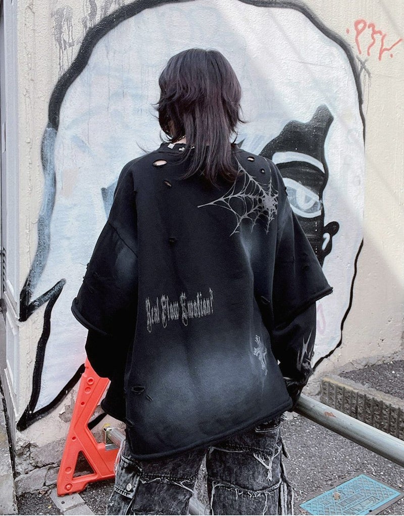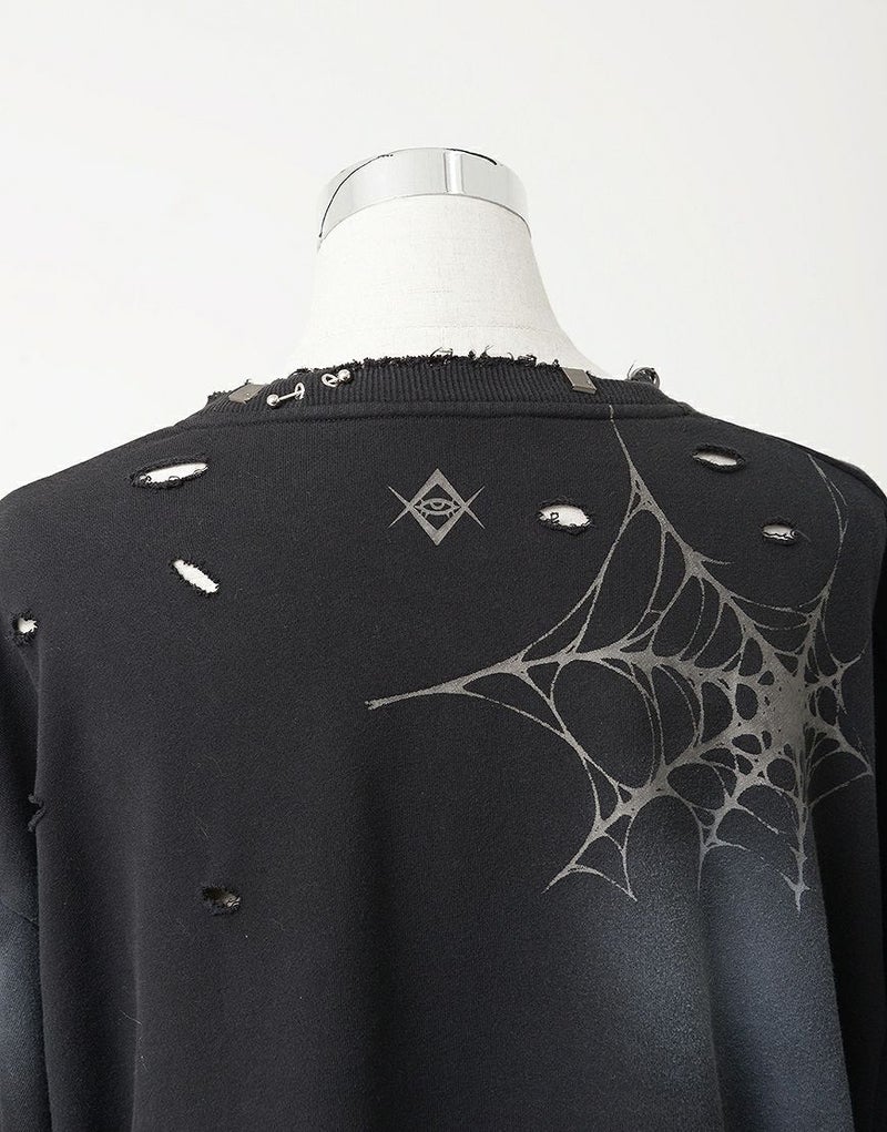 裏毛素材をベースに、各所に断ち切りディテールとダメージ加工を施した、グランジ感あふれる一着。