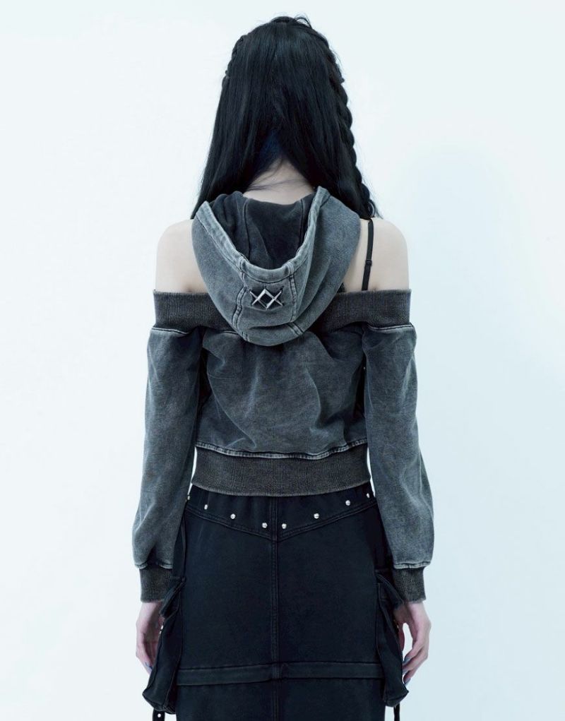 オフショル仕様で着用できるデザイン性の高いクロップド丈ジップパーカー。
