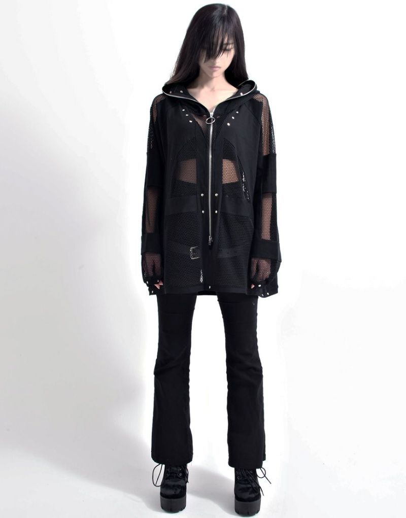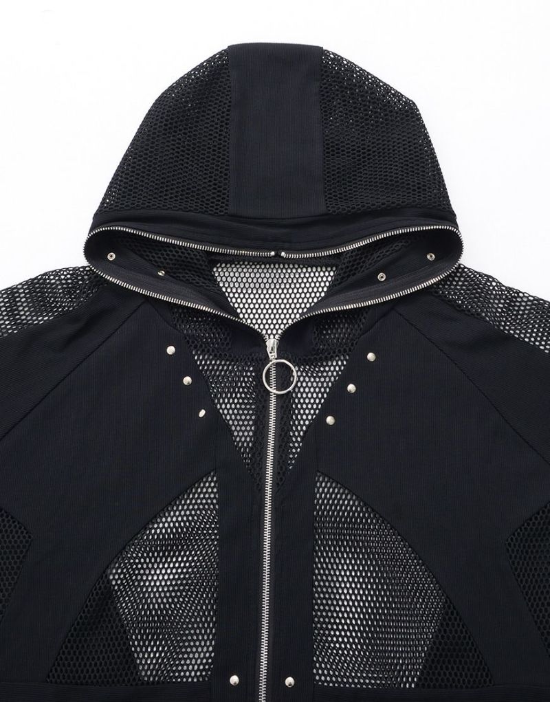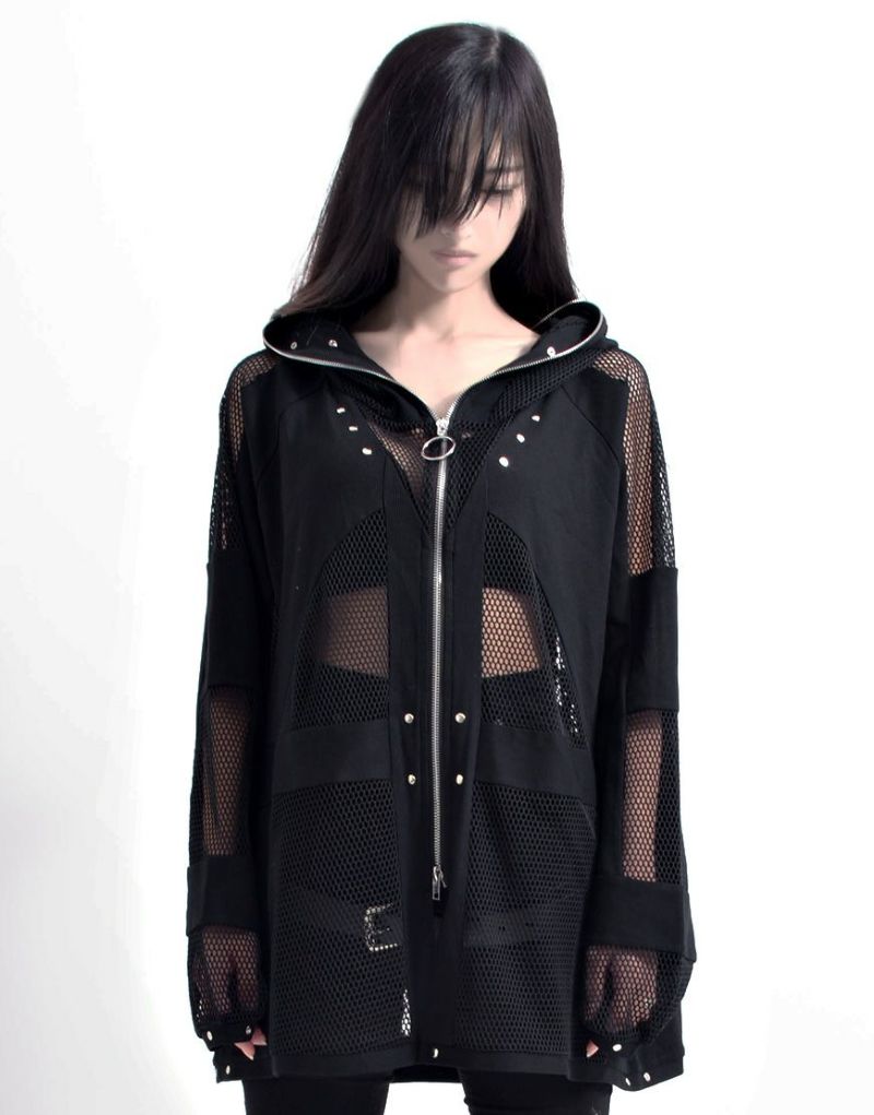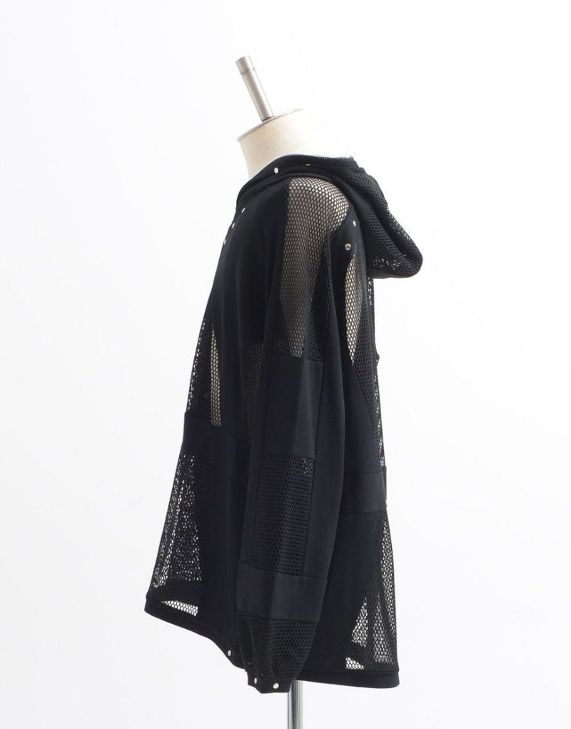 全体的に透け感のあるメッシュ生地とリブ生地の切り替えデザインをいれたパーカー。