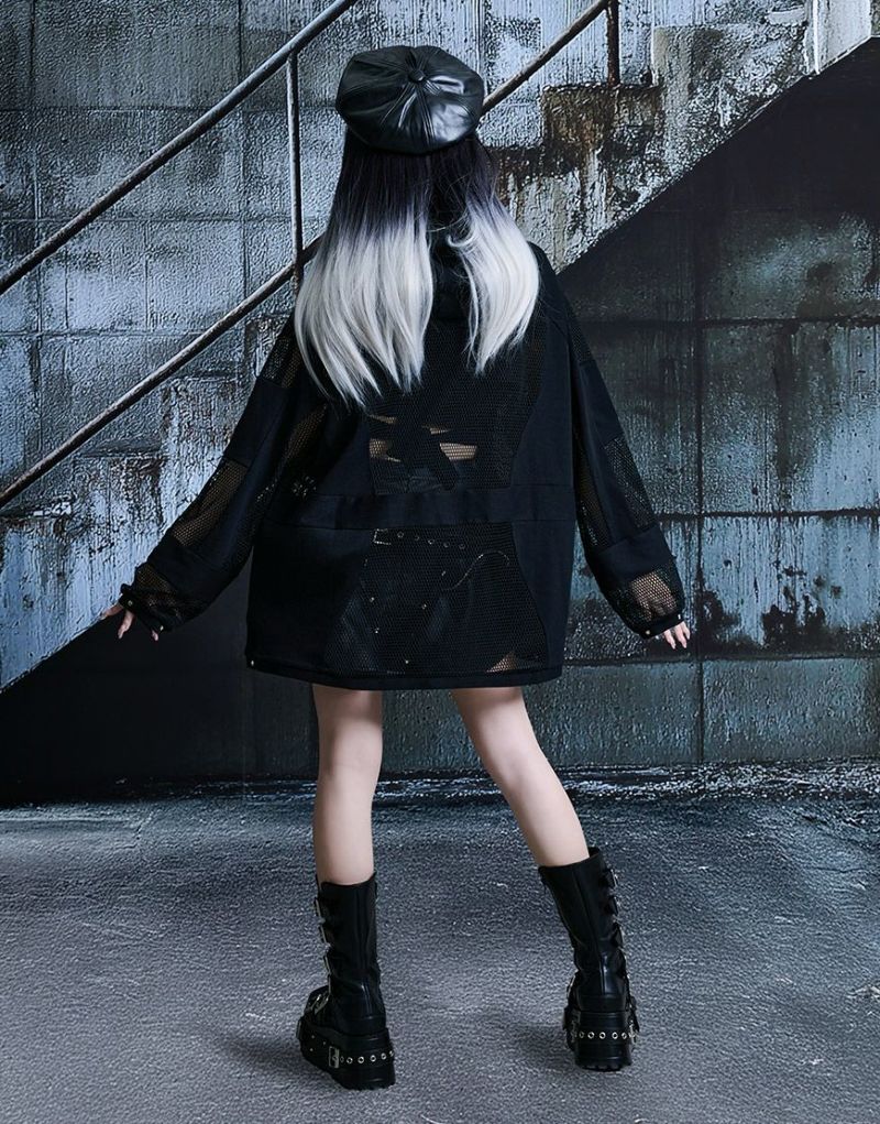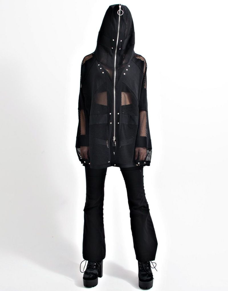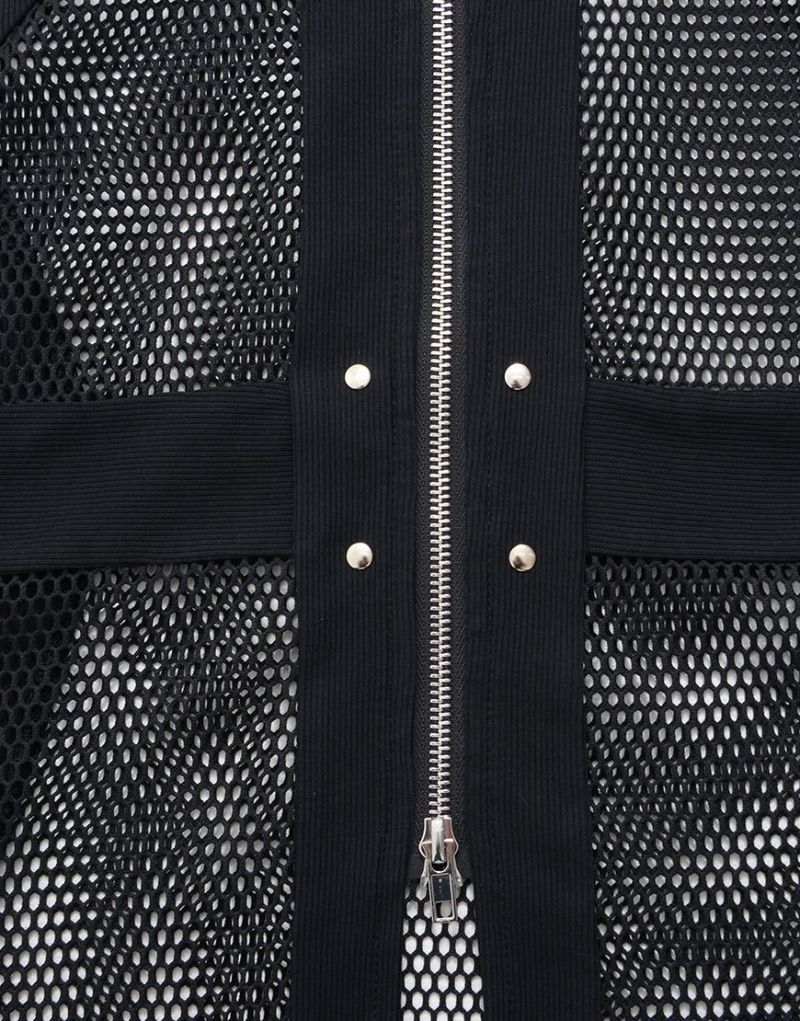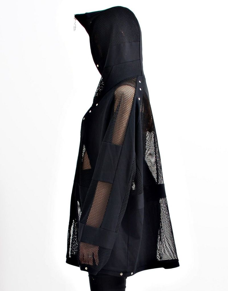 全体的に透け感のあるメッシュ生地とリブ生地の切り替えデザインをいれたパーカー。