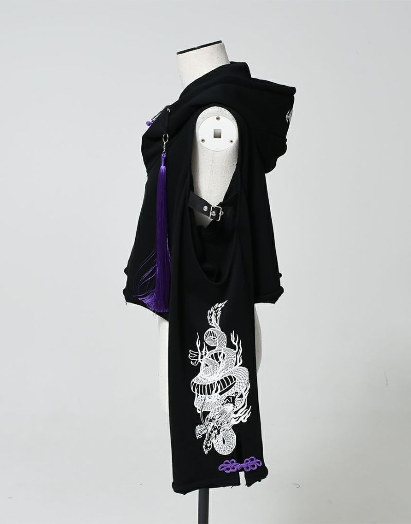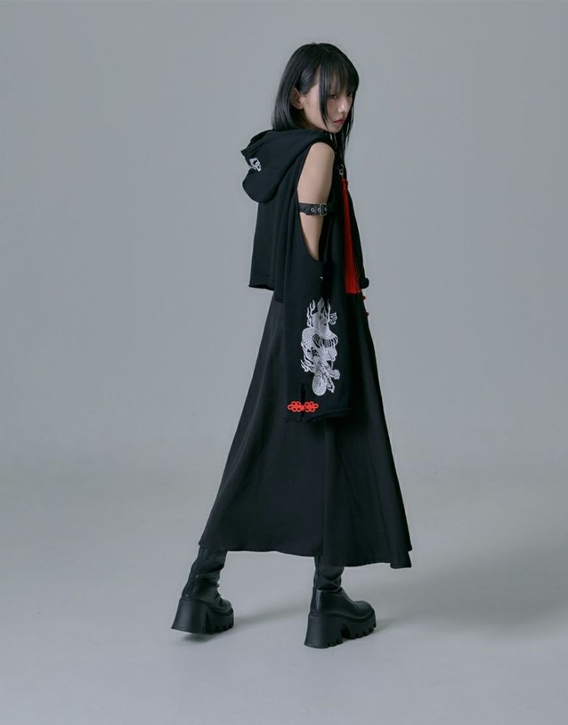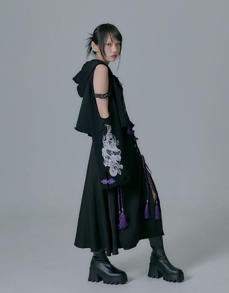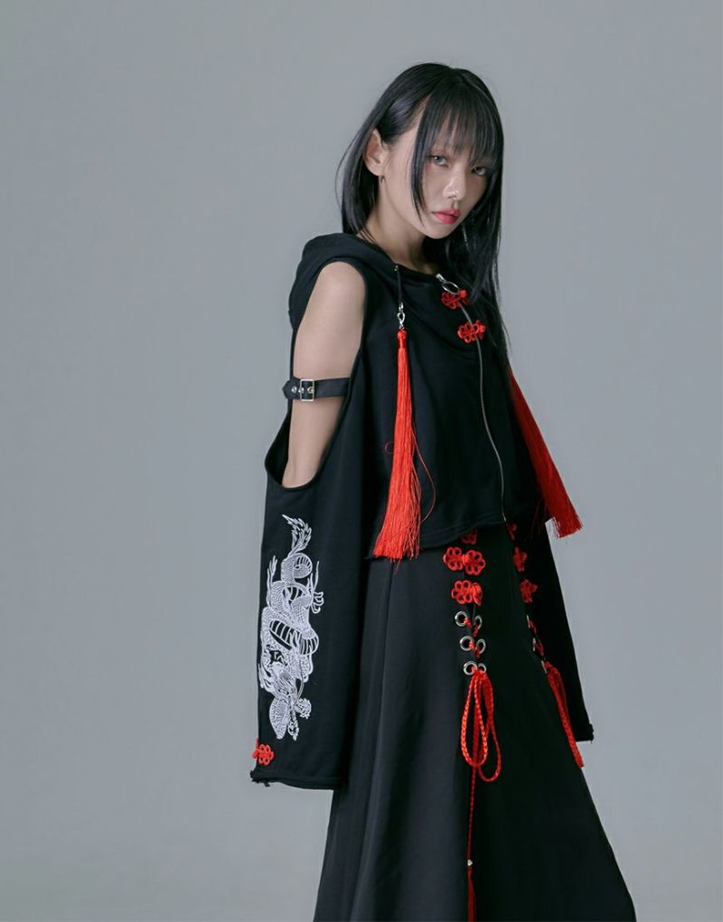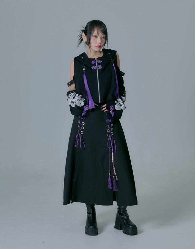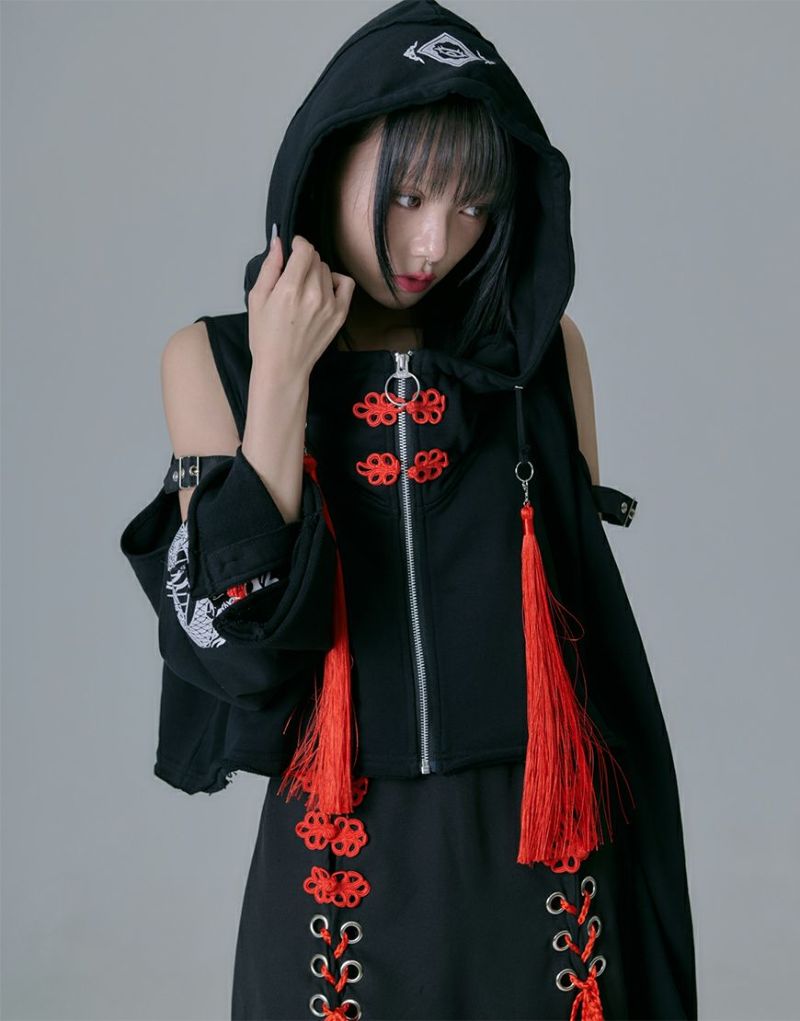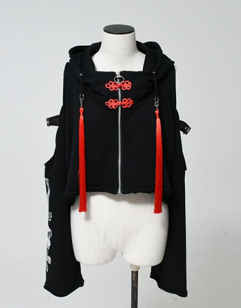 チャイナ風デザインの飾りボタンとタッセルを使用したクロップド丈のジップパーカー。