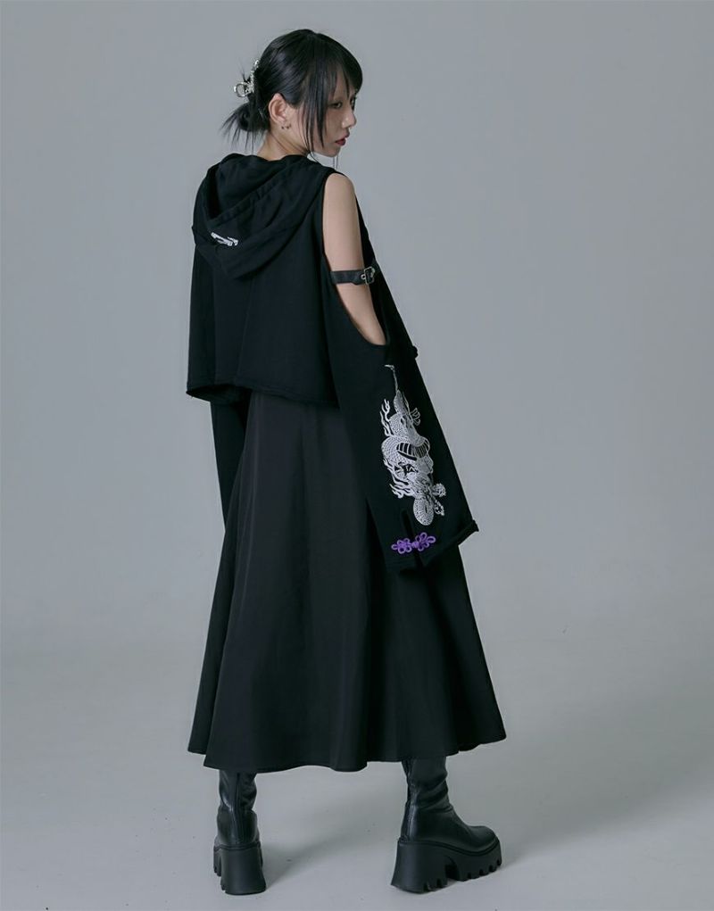 カットオフ仕様の袖口と裾に、ショルダー部分は大きくカットした斬新なデザインが魅力を引き立てます。