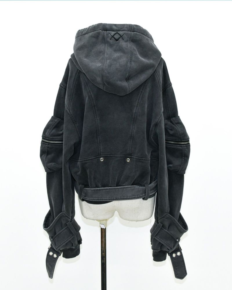 フードセンターにワンポイントで刺繍を施し、裾と袖には脱着仕様のベルト付きです。