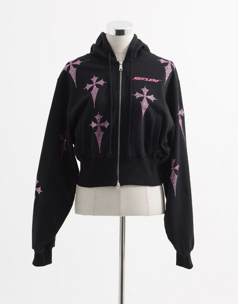 ラインストーンクロス総柄長袖クロップドジップアップパーカーが登場。