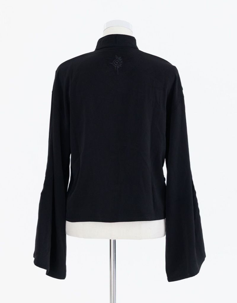 衿まわりとフロントは上品なパイピング仕様、袖は振袖のようなワイドシルエットでドラマチックな印象を与えます。