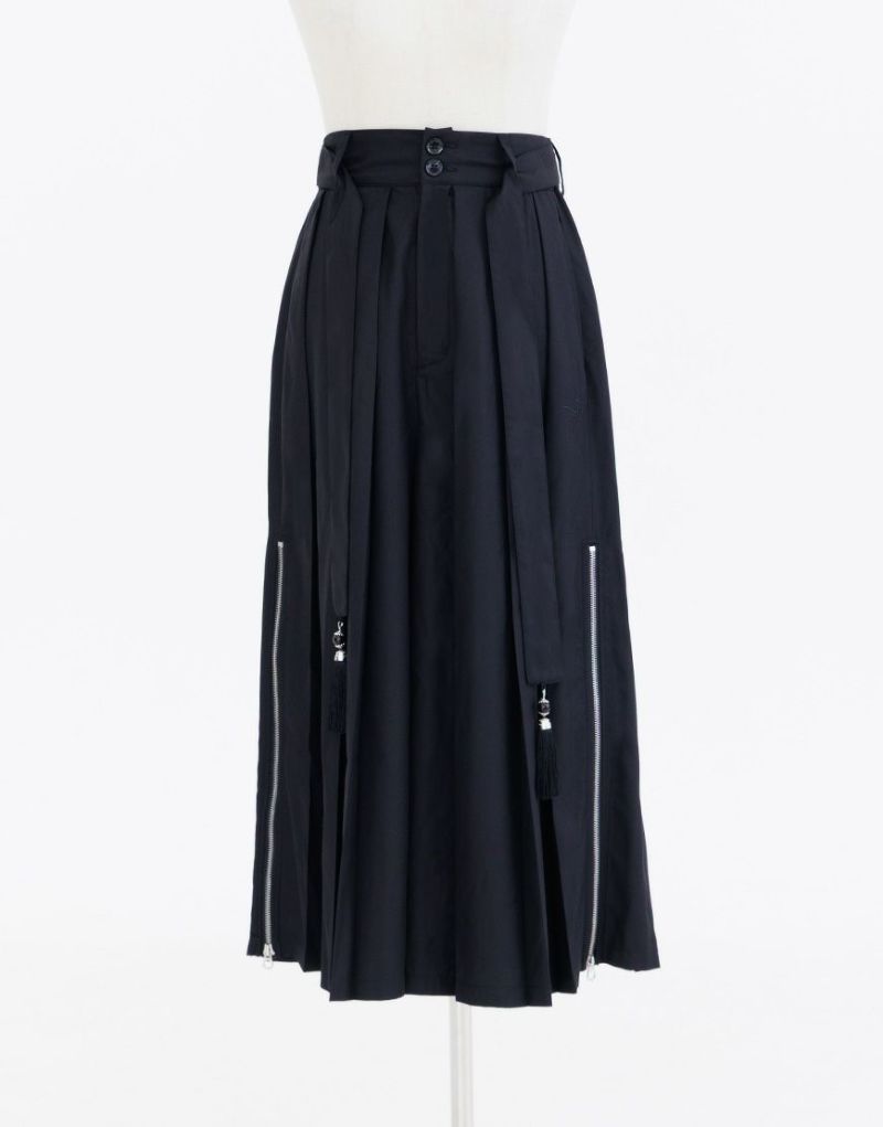 モード感漂う存在感抜群の袴風ワイドパンツ。T/R生地を使用し、落ち感のある上品な仕上がりに。