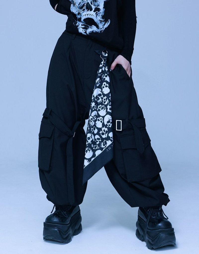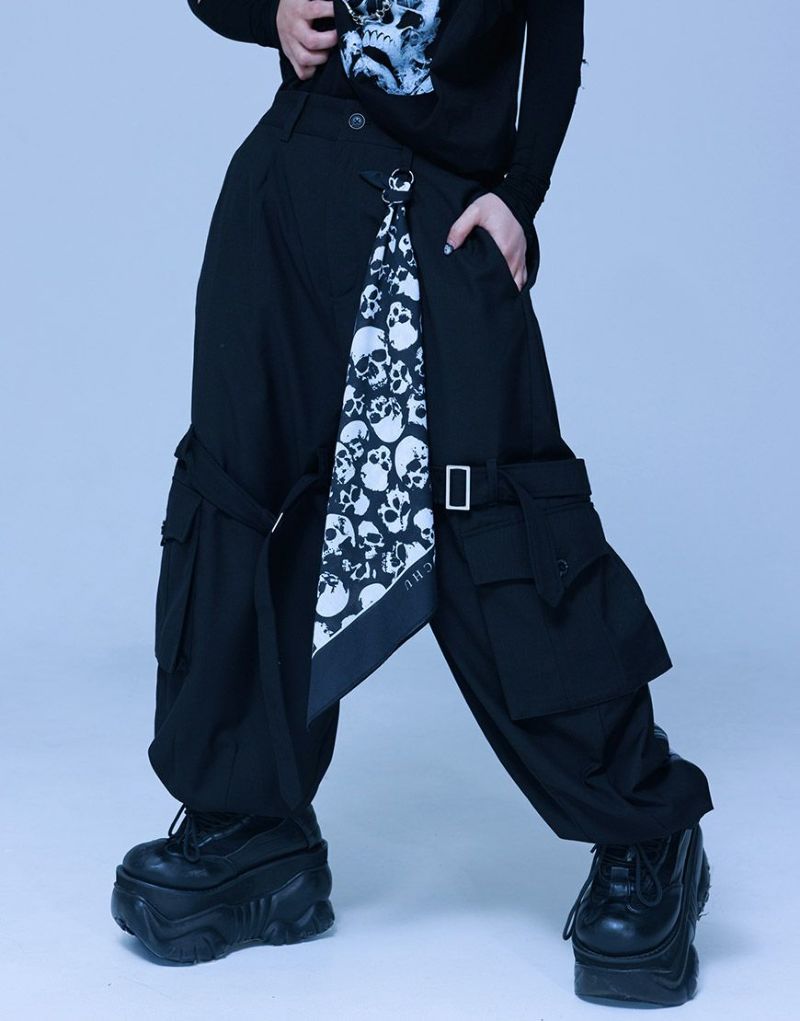 付属のスカル総柄バンダナは、パンツのループに通して垂らせば、コーデに地雷なエッセンスを一滴。
