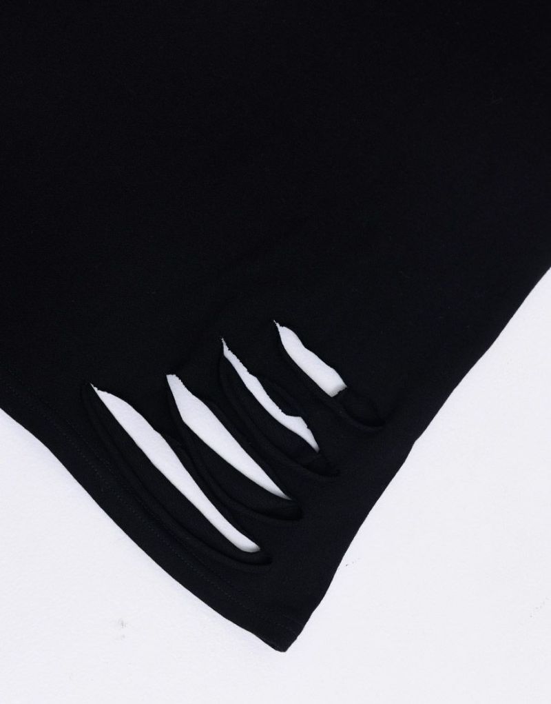 さらに前後・両脇の裾には丁寧に入れられたダメージ加工が、無秩序に見えて計算された“グランジ感”を演出。