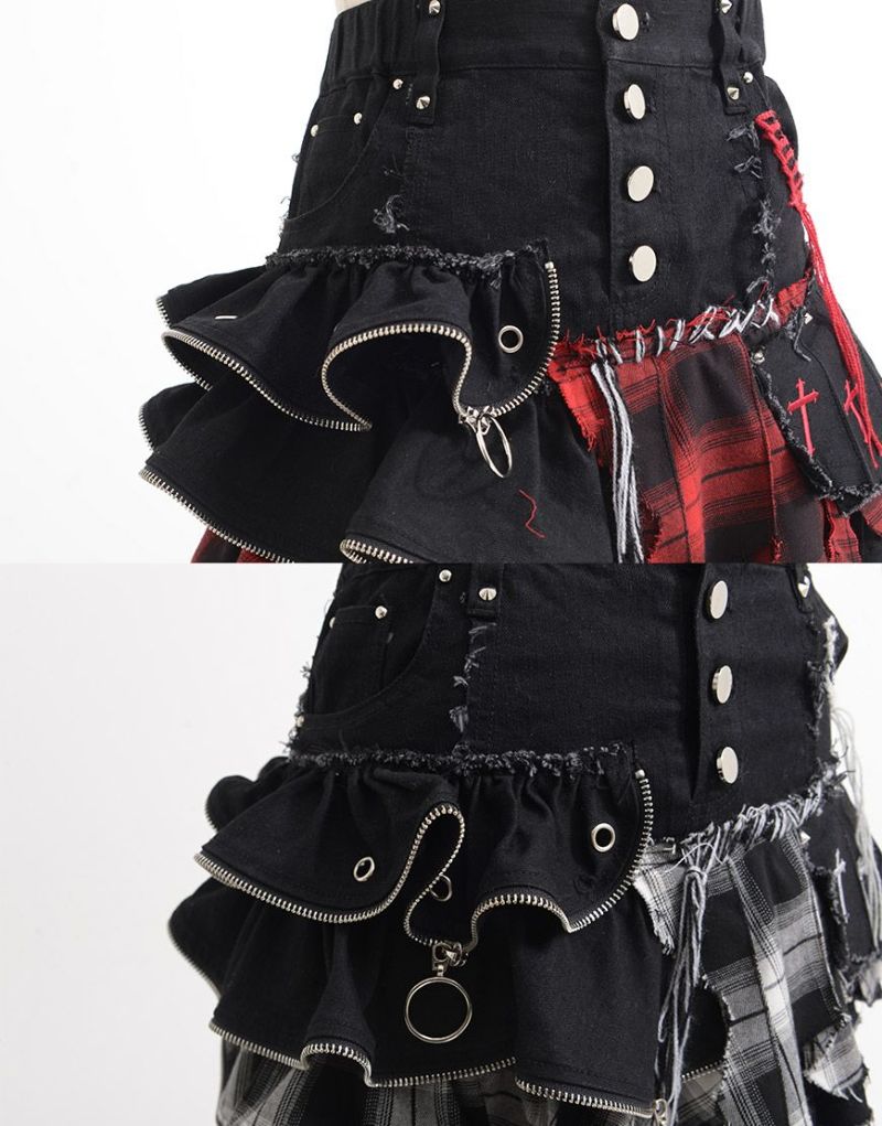 右サイドはZIP付きのフリルスカート風、左サイドはプリーツ調のパーツを重ねたアシンメトリー構成。