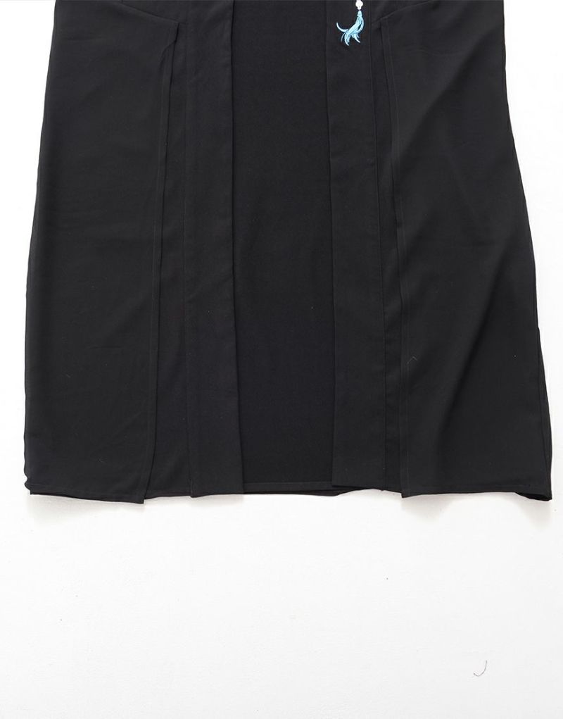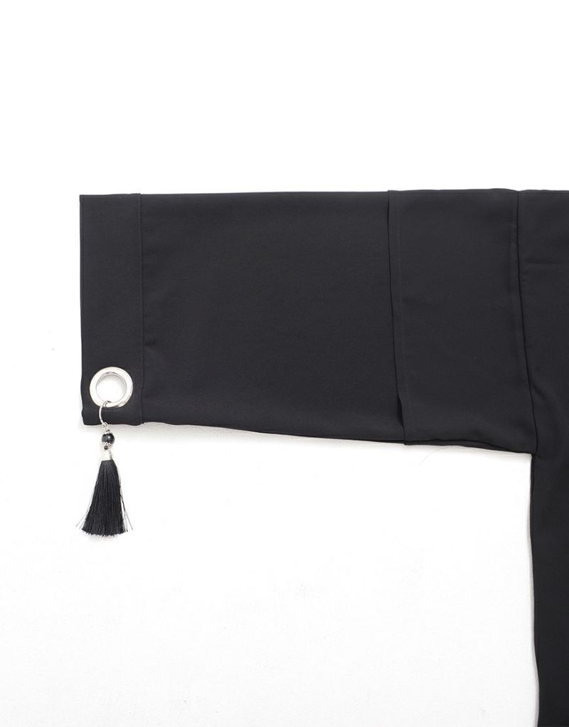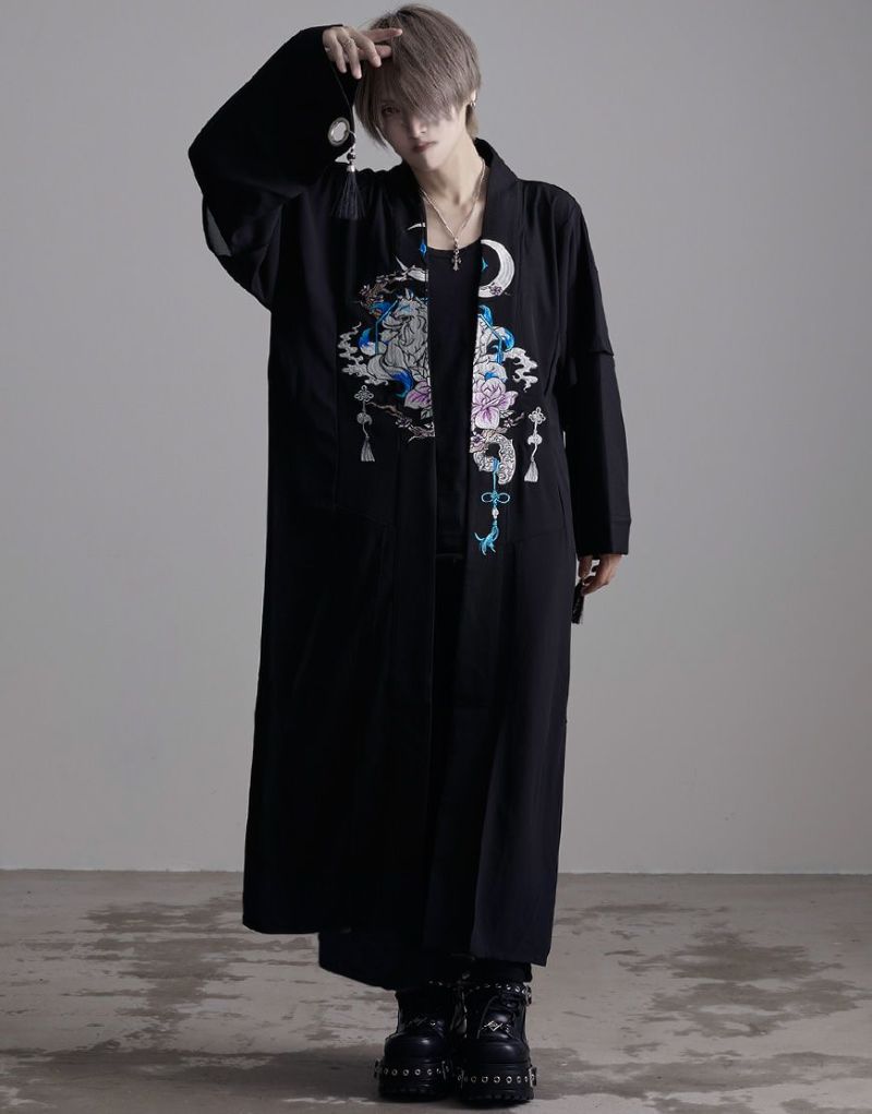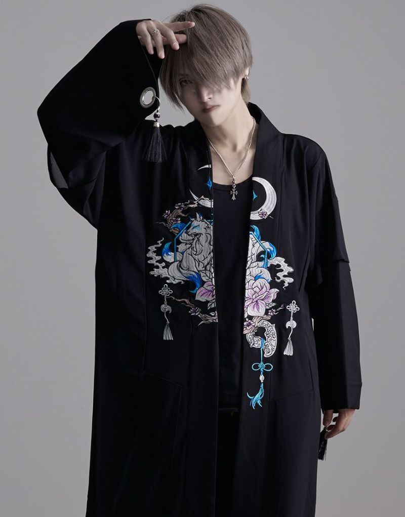 ilililより【月影妖尾】ロング羽織が登場です。 フロントに迫力のある九尾の刺繍が施された和風のロング羽織です。 着物風のシルエットが特徴的で、シフォン生地とのフェイクレイヤードが魅力的です。 袖口には、ハトメにタッセルがあしらわれたデザインが施されています。 和装としてはもちろん、モードなコーディネートにもぴったりな一枚。 高級感のある生地感で仕上げ、 シンプルだからこそ生地や質感に拘りたい方に贈るアイテム。