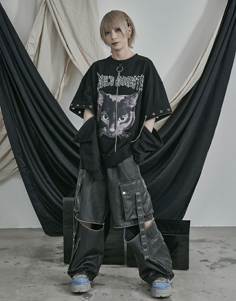 病みかわいい黒猫グラフィックをフロントに大きくプリントしたデザインスウェットトレーナー。