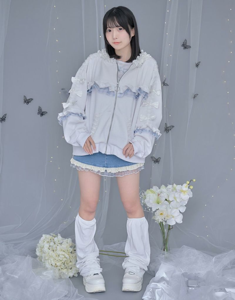 ililil【イルイルイル】より生クリームフリルのバブみ全開2wayパーカーが登場です。 まるで生クリームみたいなふわふわフードが主役 共地フリルと淡いチェックシフォンが、さりげない甘さを添えてくれるジップパーカー。 お袖は取り外しOKで、気分や季節に合わせてアレンジ自在♪ 「天使界隈さん」や「ゆめかわさん」にぴったりな、やさしいホワイトの一枚です。