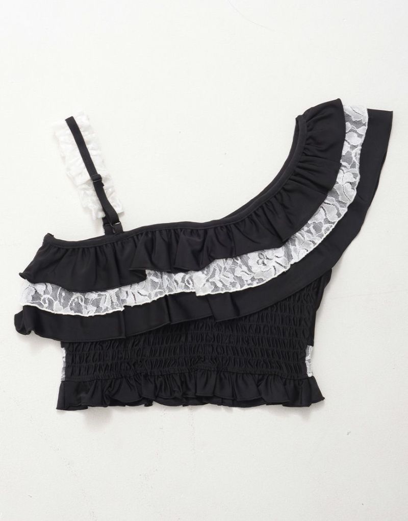 アシンメトリーなデザインのトップスにたっぷりのレースを重ね、視線を奪う主役級の存在感。