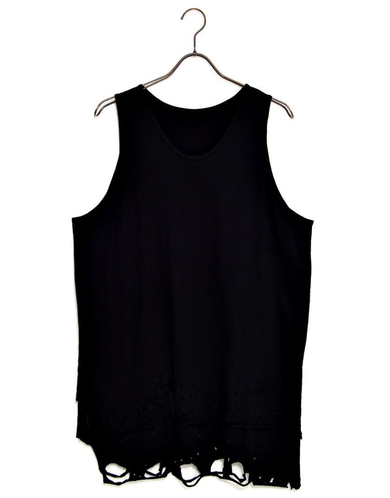 裾のレイヤード部分にオパール加工によるダメージを施したオーバーサイズのロングタンクです。