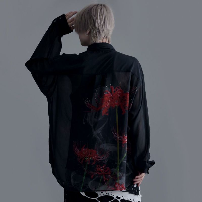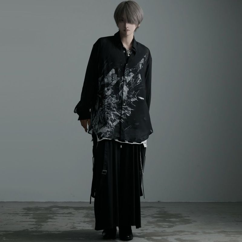 肌が透けるシフォン生地とアートな花柄グラフィックが相まって魅力ある雰囲気を醸した花柄シャツ。