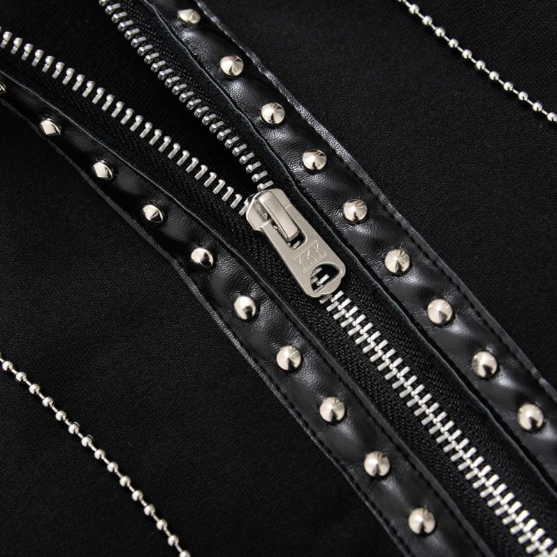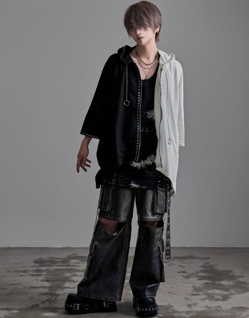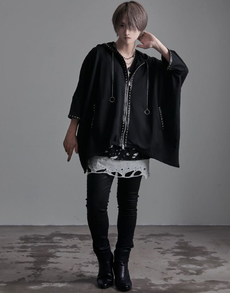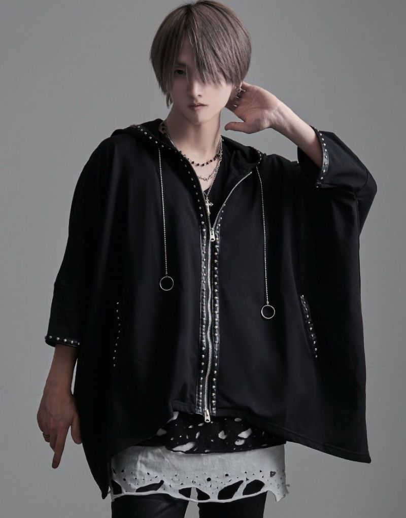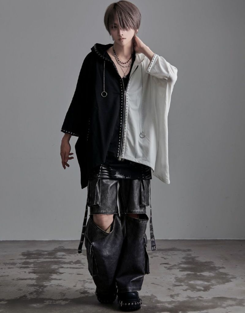 特徴的なポンチョシルエットになっており首元には手錠のようなデザインチェーンを配置した細かいディテールまで拘った存在感溢れるヴィジュアル。