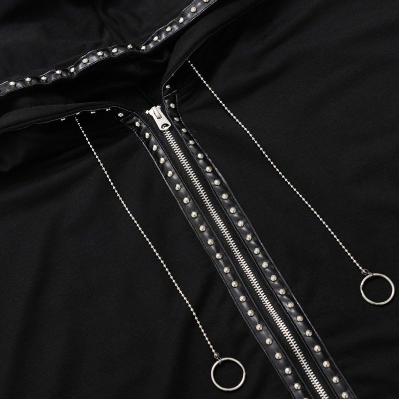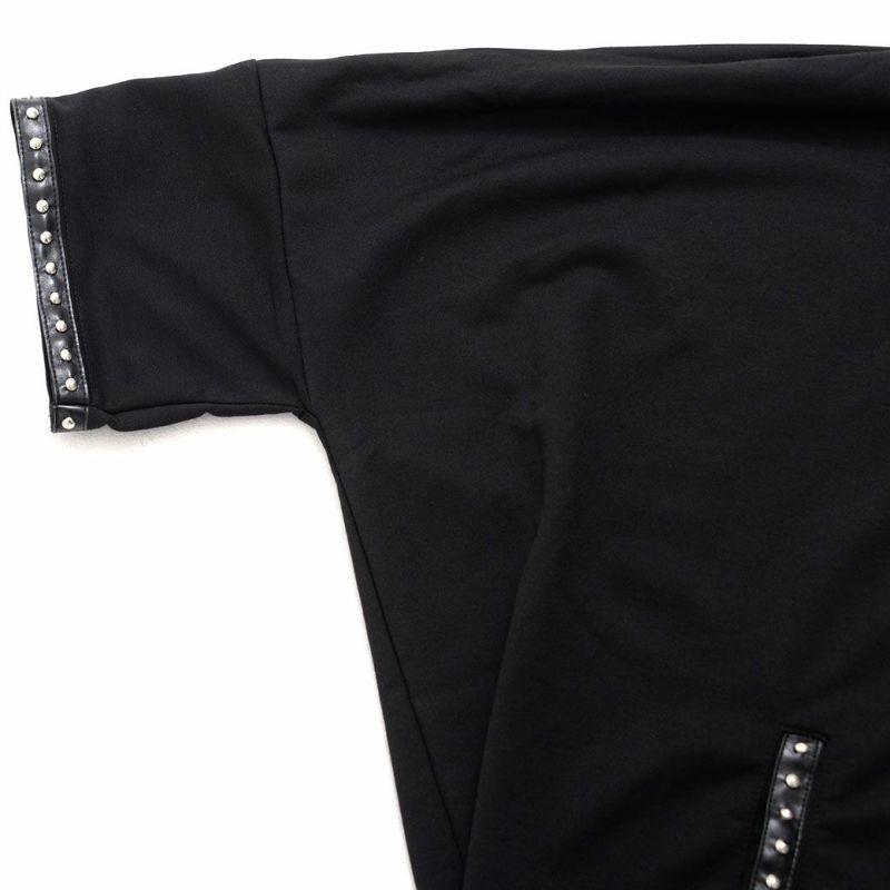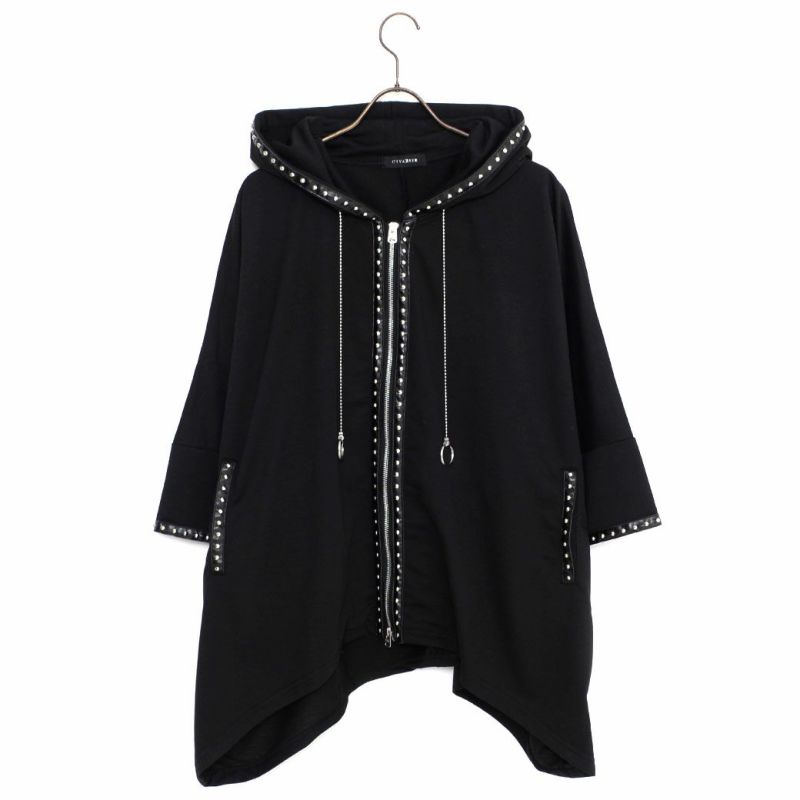スタッズPUレザーテープをフード~前中心、袖口、ポケット口に配置したポンチョジップパーカーです。
