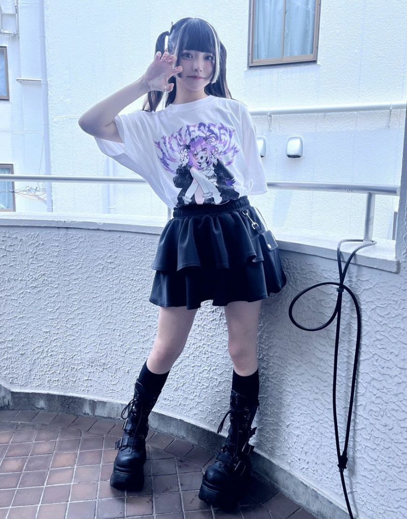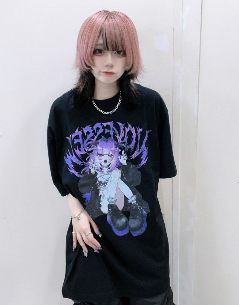 アニメ調で描かれたキャラクターたちは、メッシュトップスや厚底シューズなど、ストリートと病みかわをミックスしたファッションで登場し、まるで"着る推し"としての存在感を放ちます。