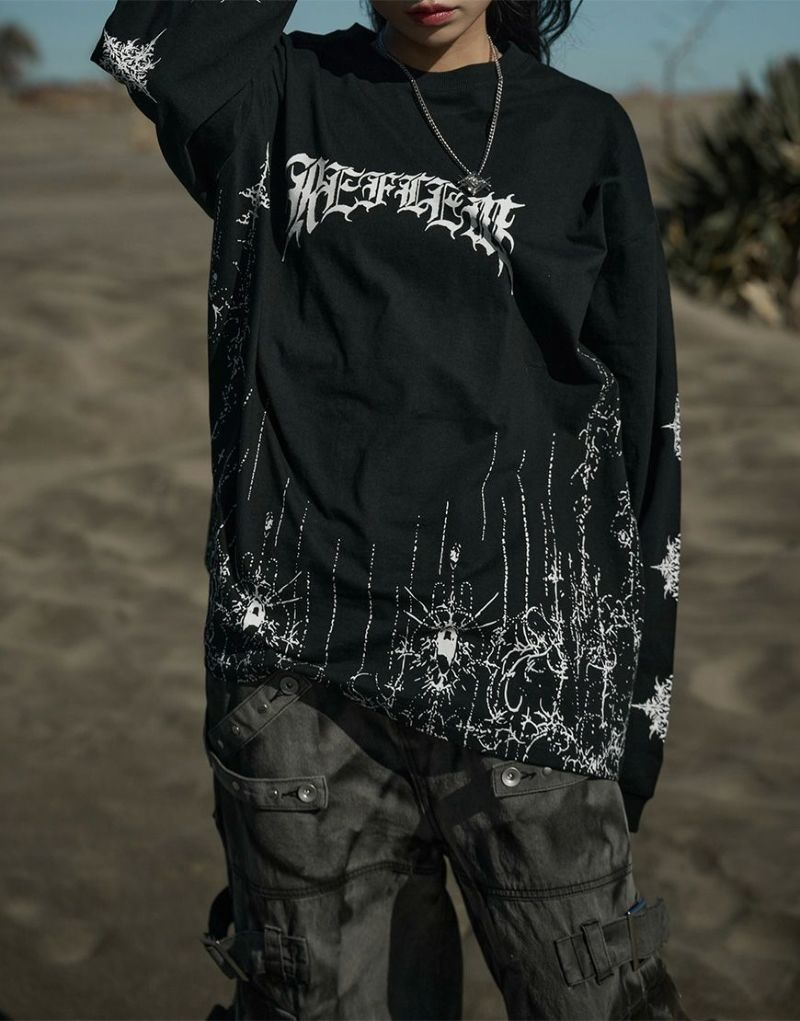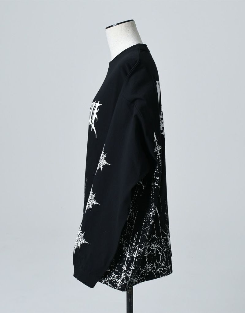 フロント、バック、袖にロゴやゴシックテイストのクロス、翼のプリントでダークな雰囲気を演出したインパクトある長袖Tシャツです。
