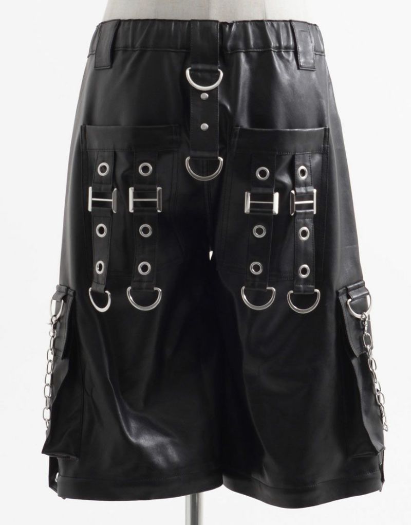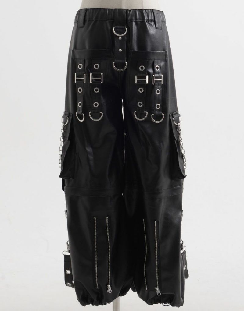 PUレザーを使用した存在感抜群のワイドシルエットボンテージパンツ。