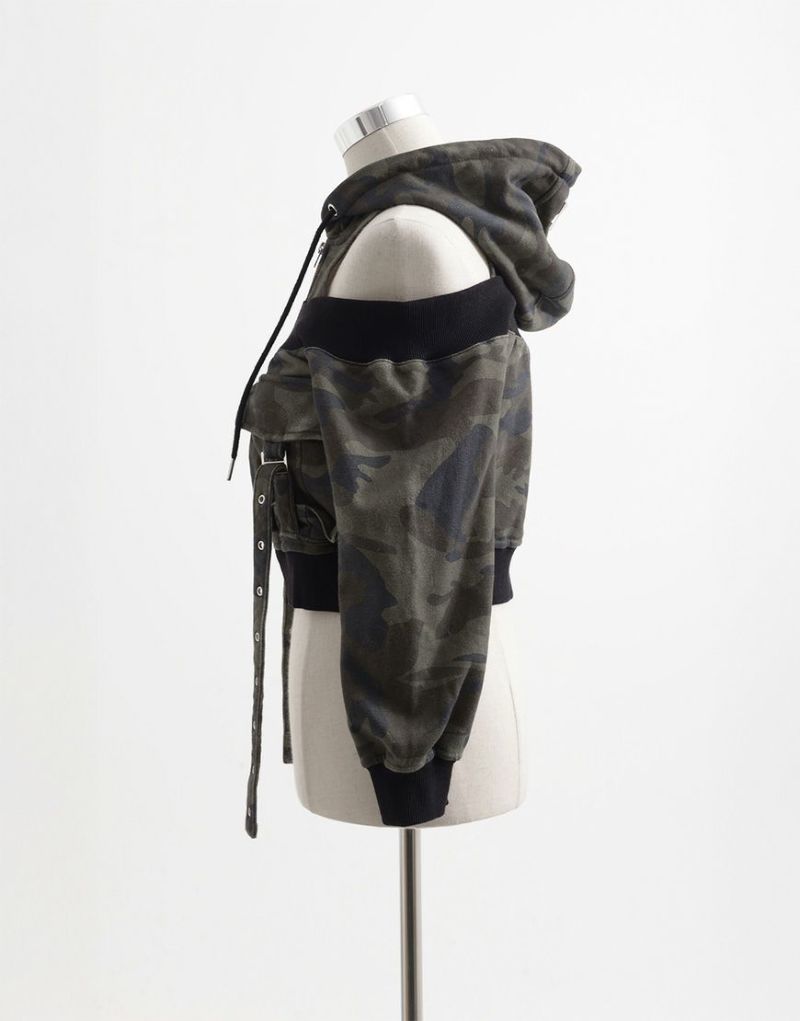 オフショル仕様で着用できるデザイン性の高いクロップド丈ジップパーカー。