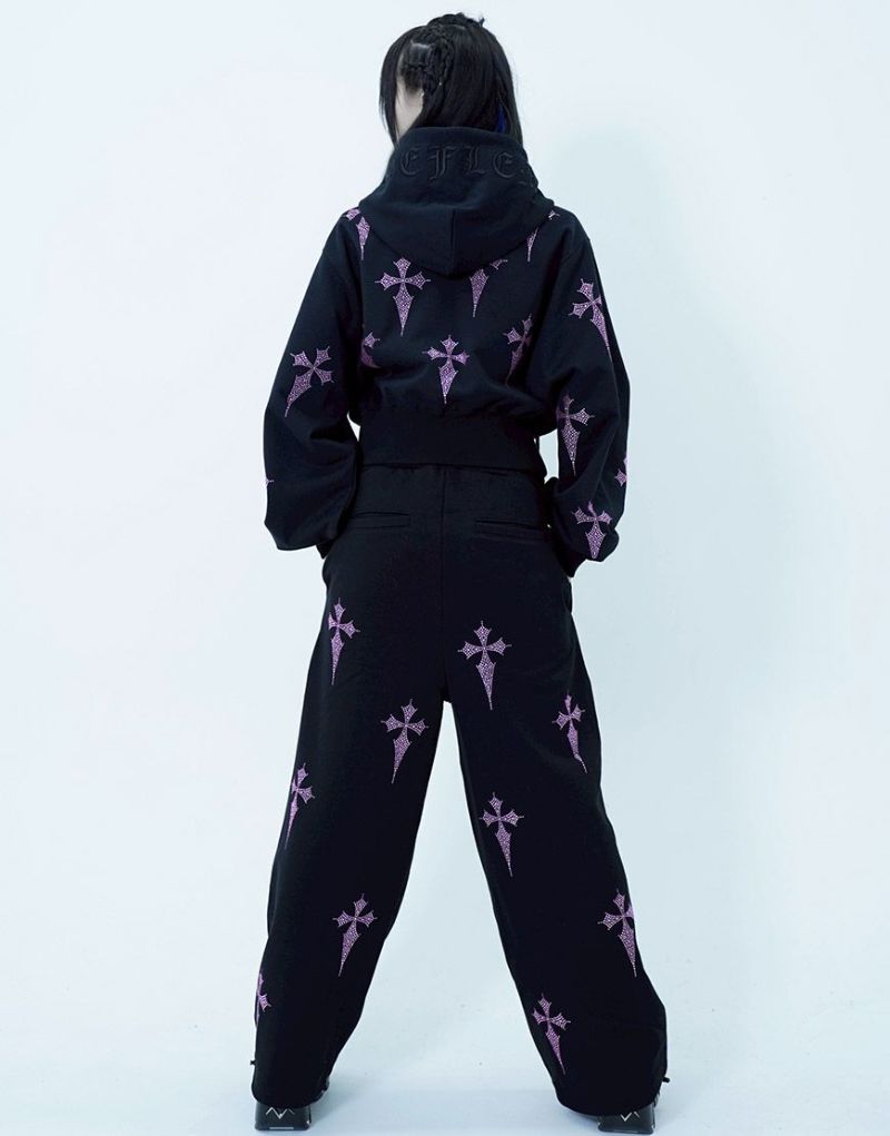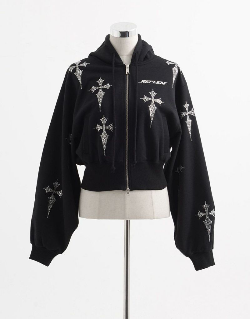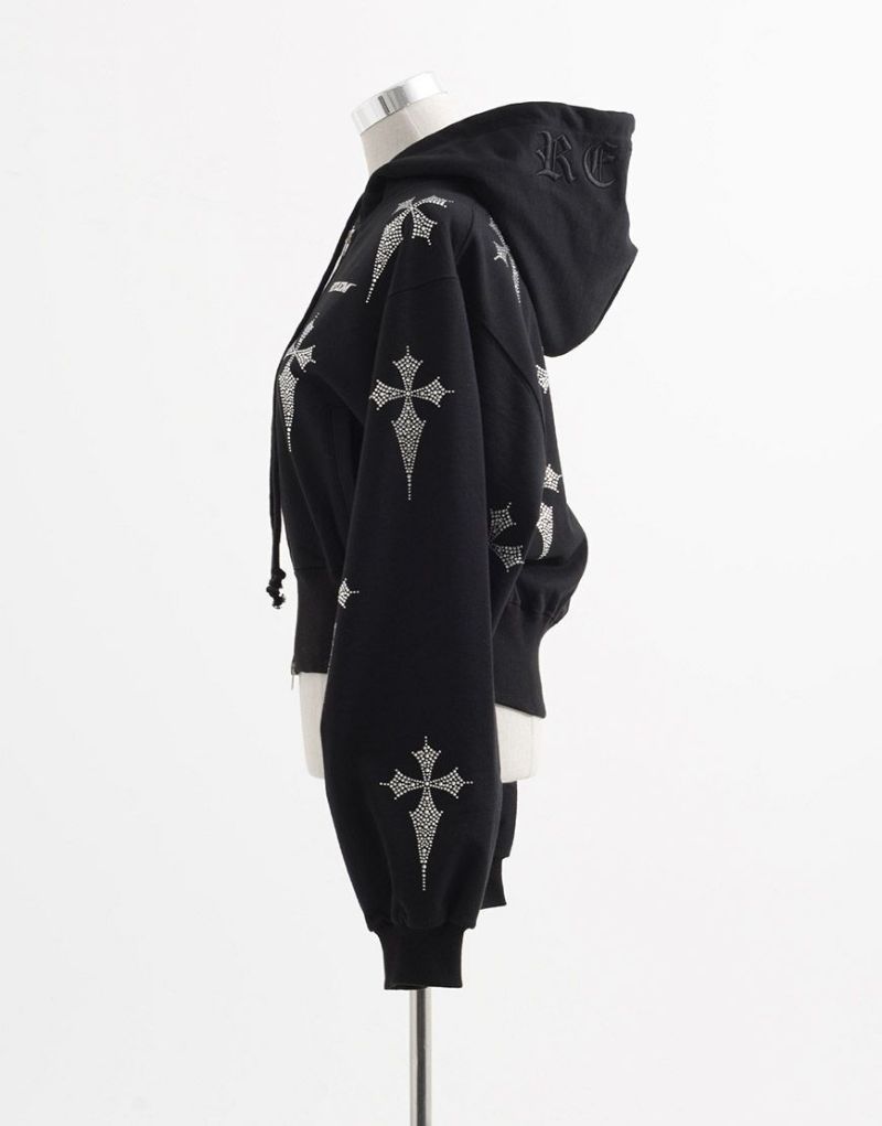 ラインストーンクロス総柄長袖クロップドジップアップパーカーが登場。