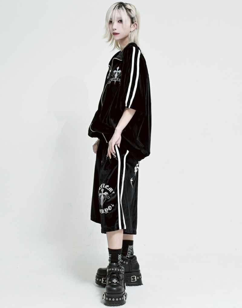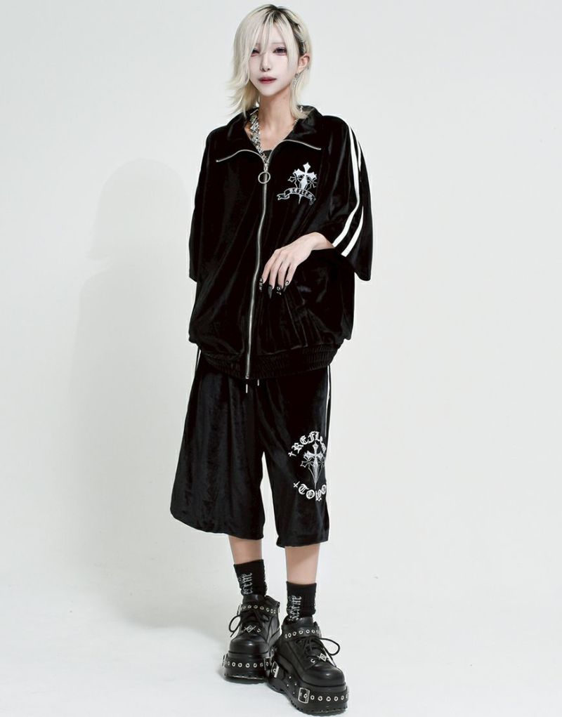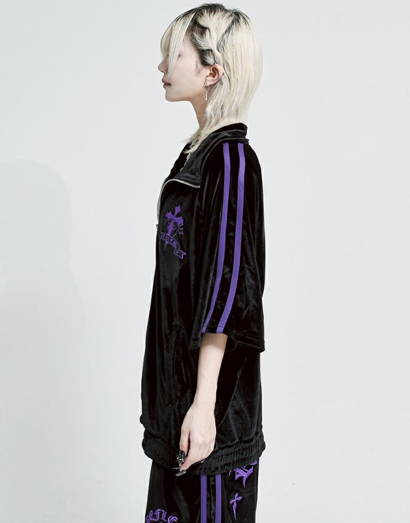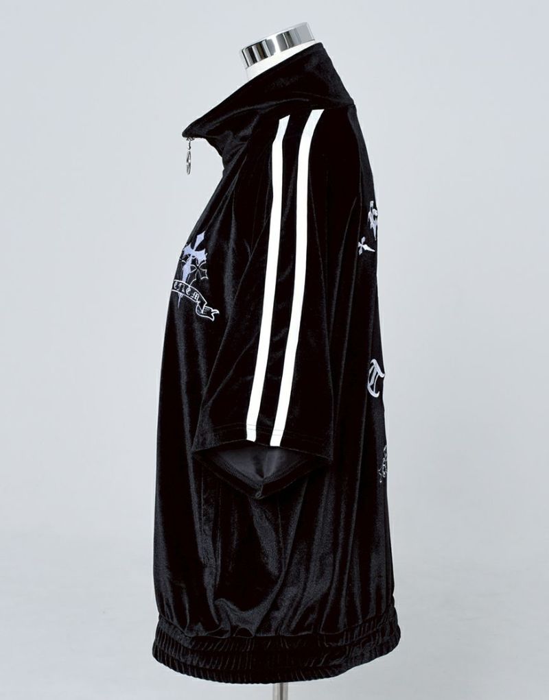 袖には定番のジャージ生地を使った2本ラインを別布で切り替え、スポーティーさとゴシックテイストを融合したデザインに仕上げました。
