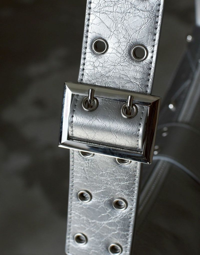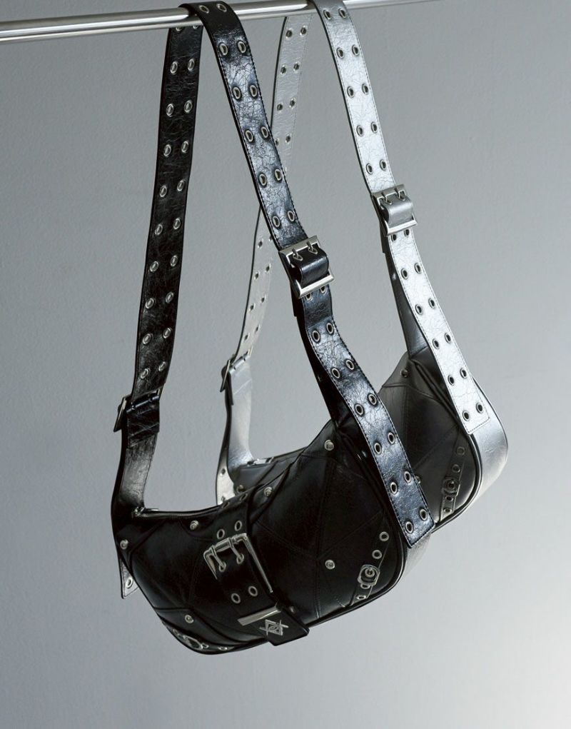 ワイドなショルダーベルトにはアイレットを打ち込み、細部までエッジの効いたデザインに。