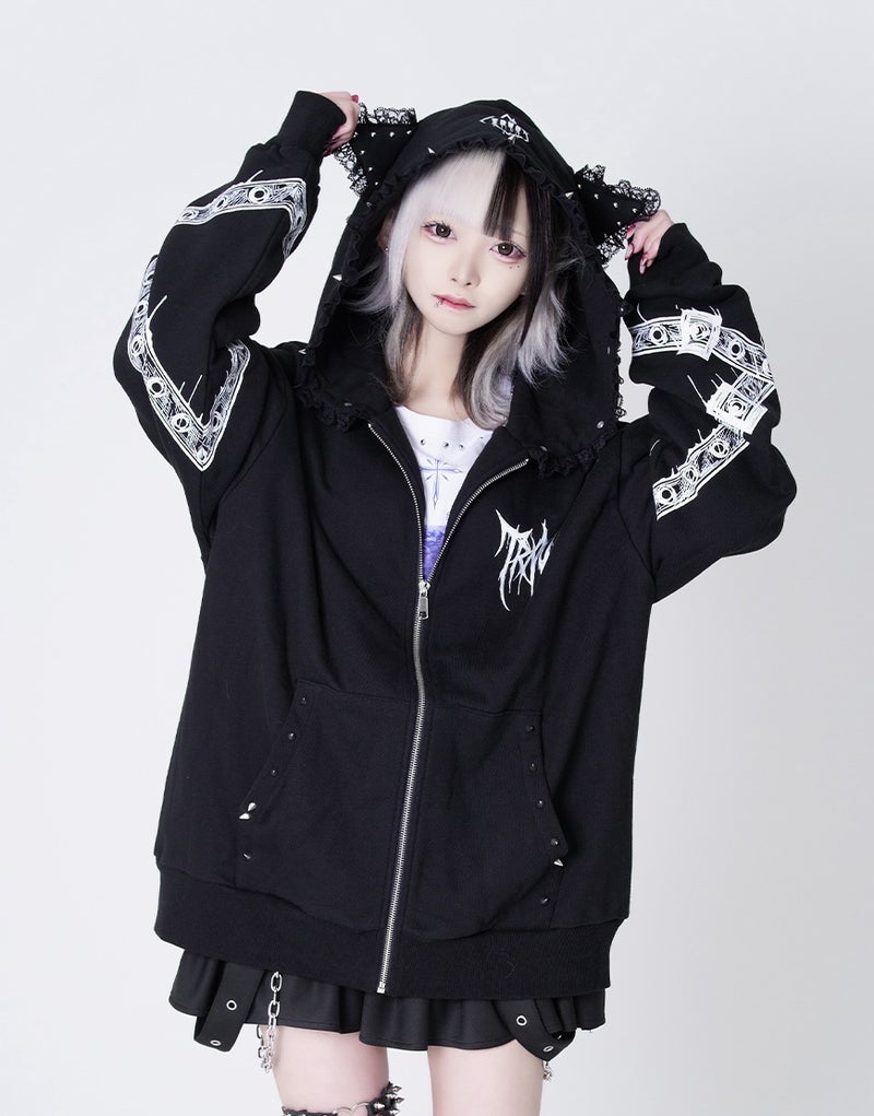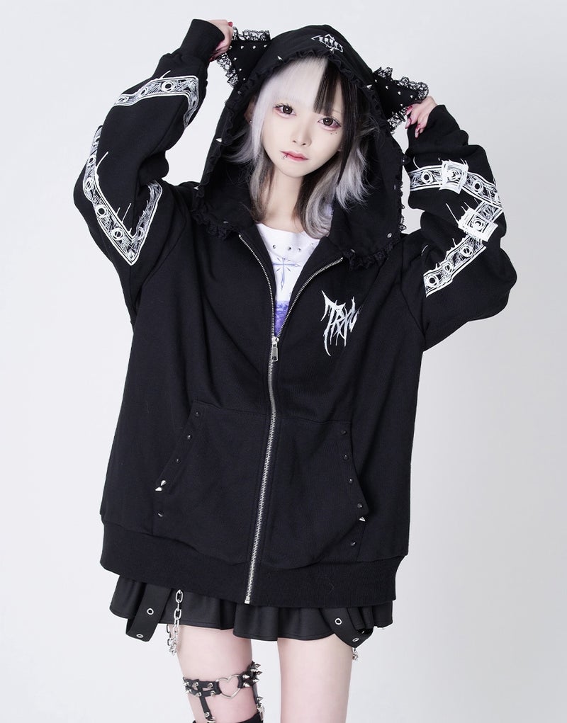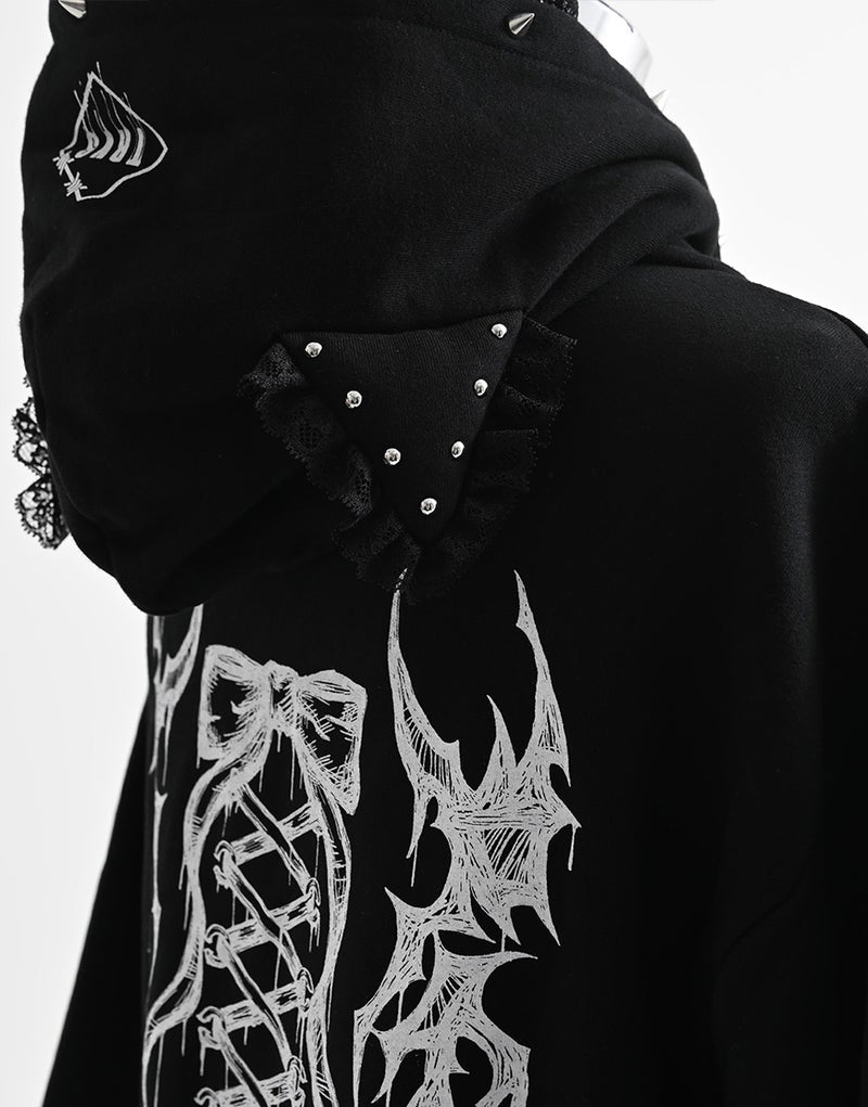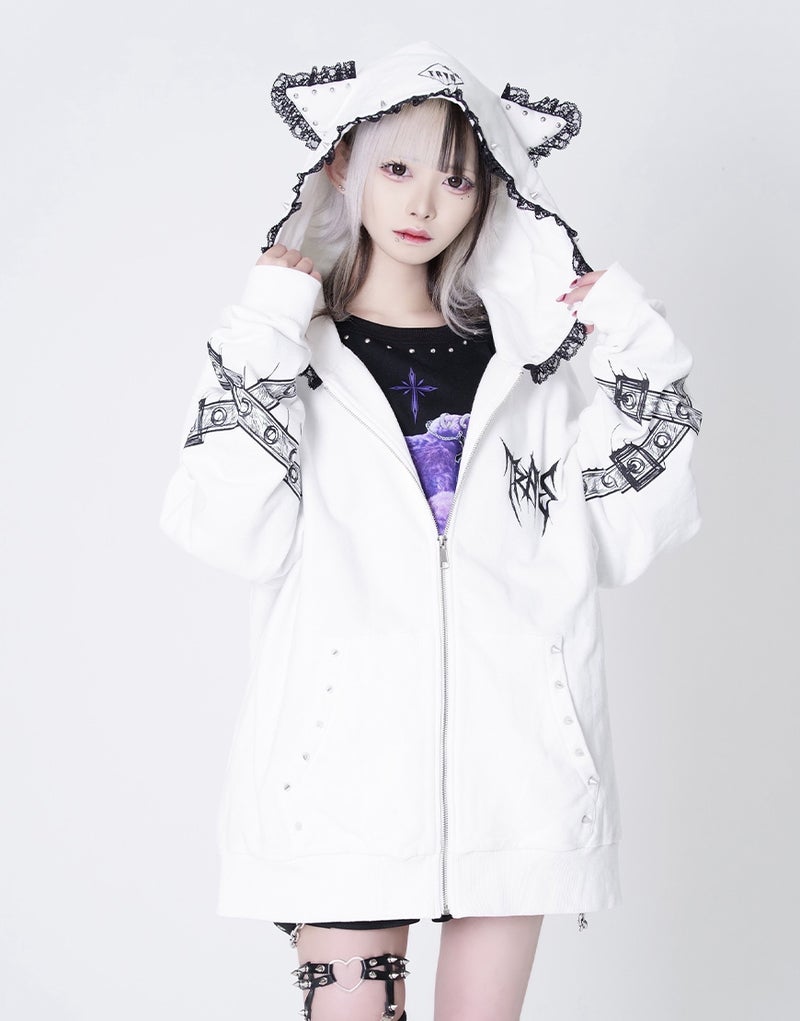 フードには猫耳デザインを採用し、縁には繊細なレースをあしらうことで、ハードさの中に退廃的で甘いニュアンスをプラスしました。