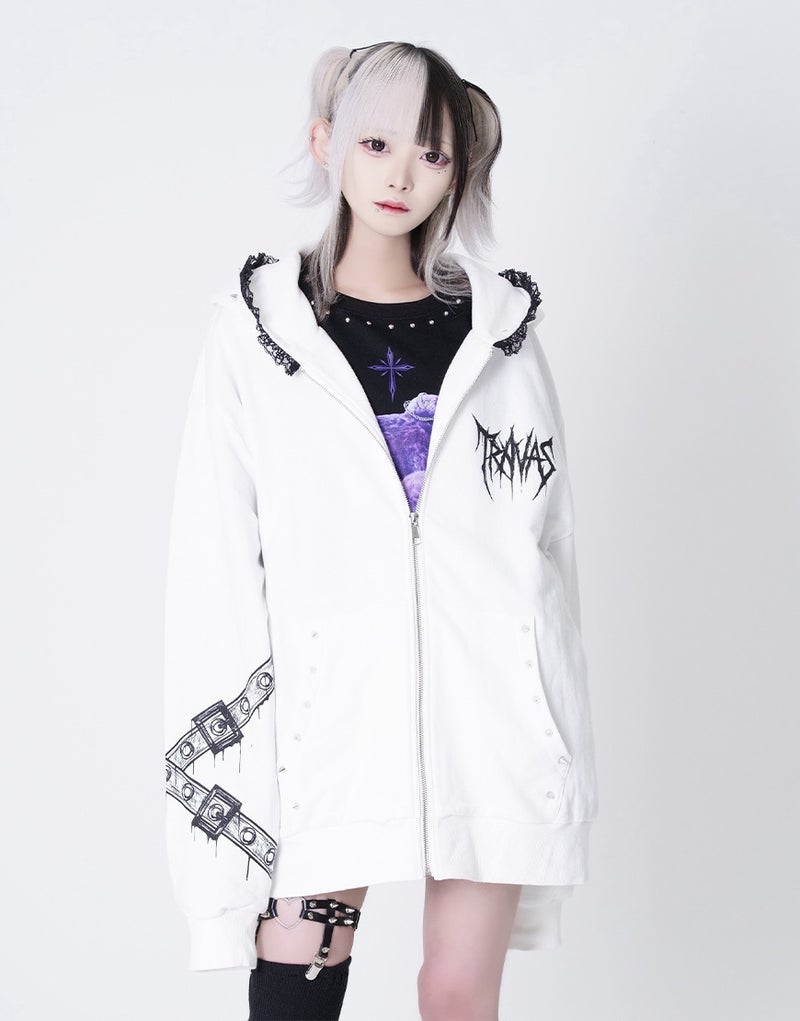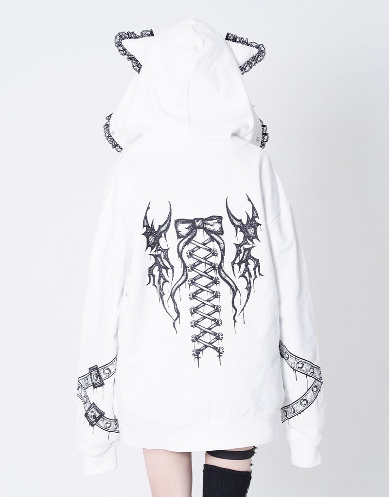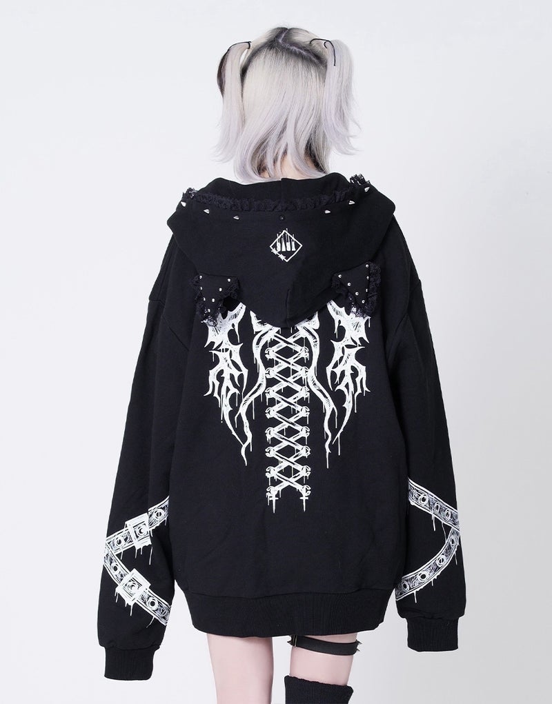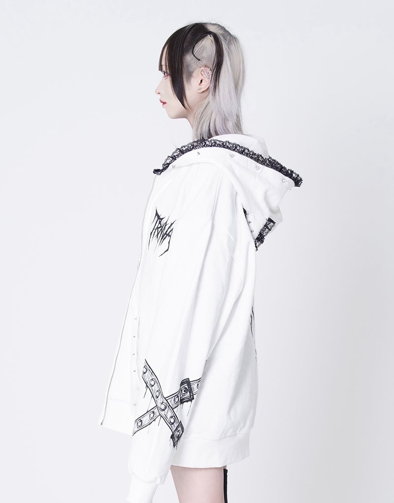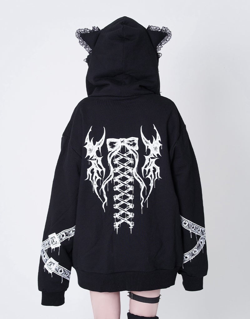 フードには猫耳デザインを採用し、縁には繊細なレースをあしらうことで、ハードさの中に退廃的で甘いニュアンスをプラスしました。