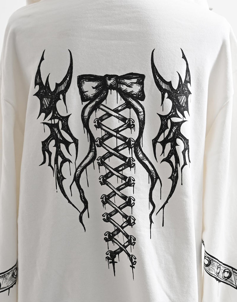 背面にはコルセットを思わせるグラフィックプリントを大胆に施し、TRAVAS TOKYOならではのダークファンタジーな世界観を表現しています。