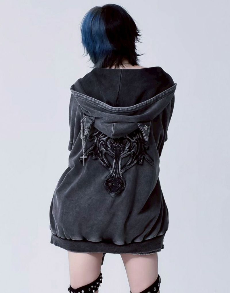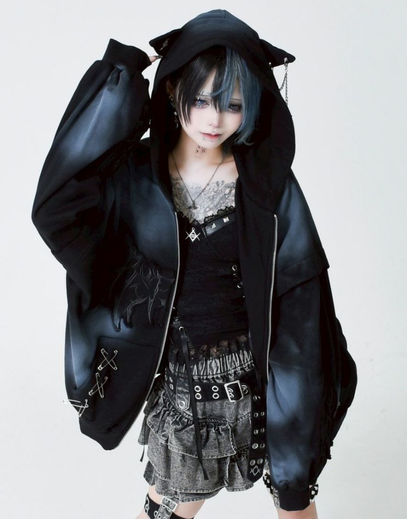 猫耳部分のチェーンパーツにはクロスチャームをセットし、病み感のある神秘的なニュアンスをプラス。