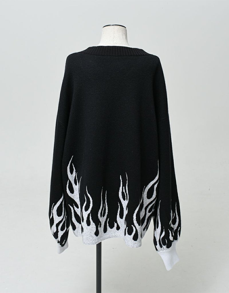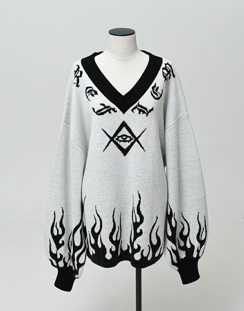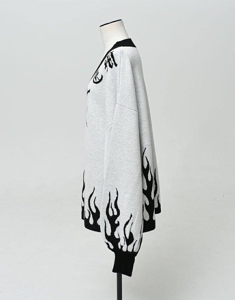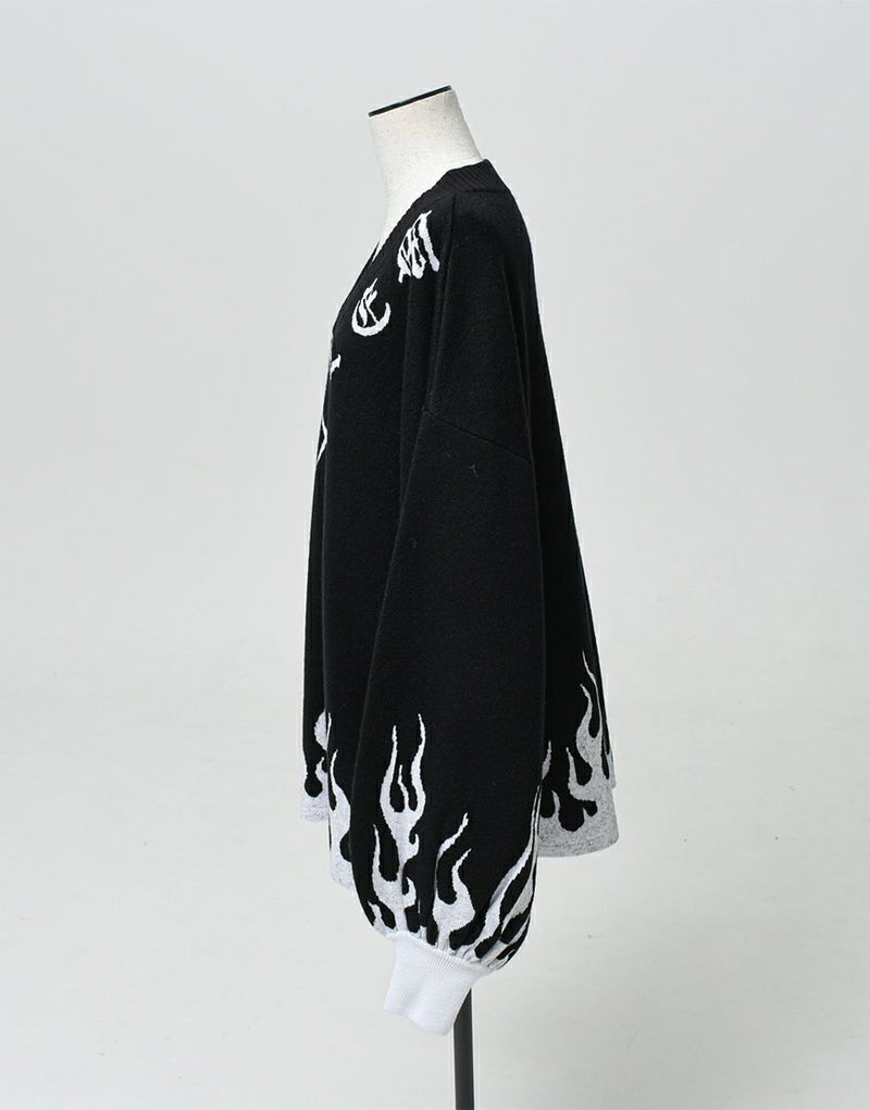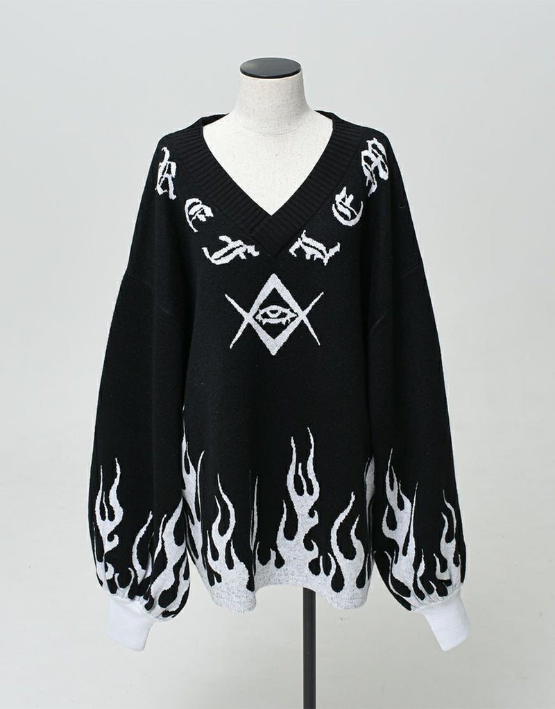 Vネックに沿うようにロゴとモチーフを入れ、裾・袖口上にファイヤーパターンを入れたプルオーバーニットです。