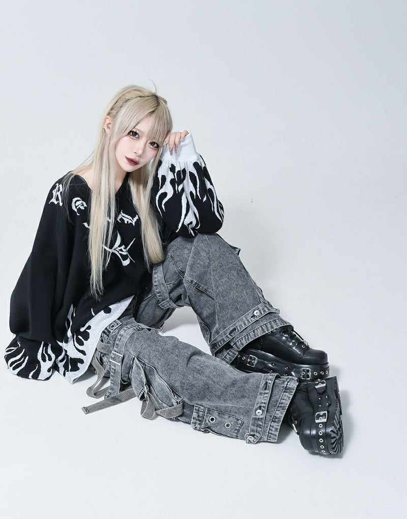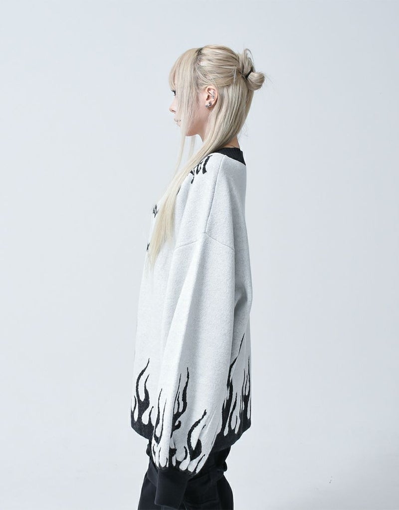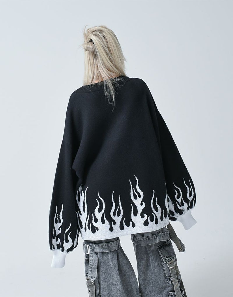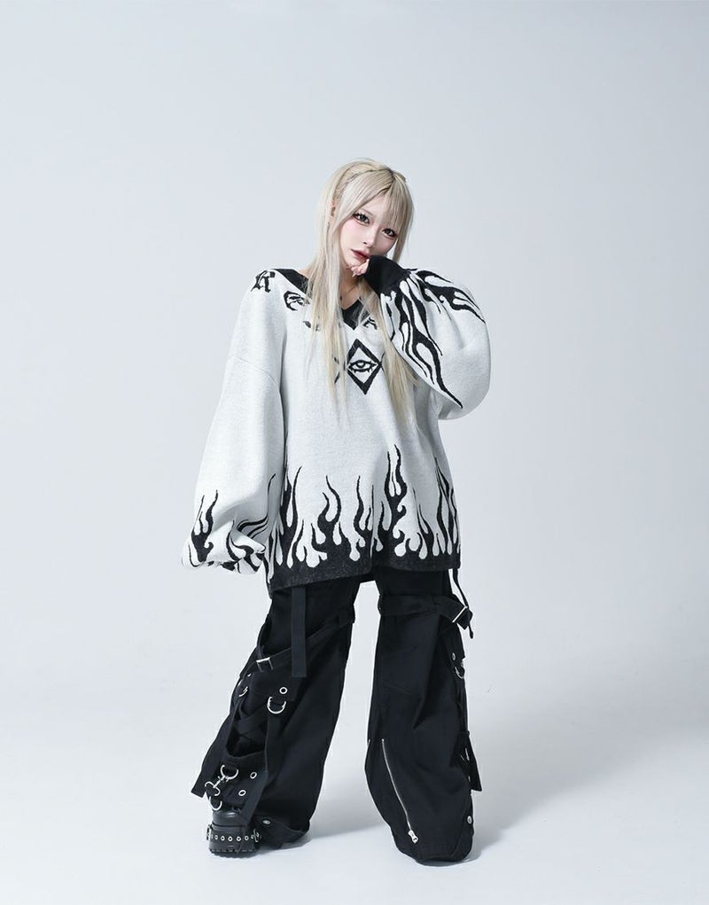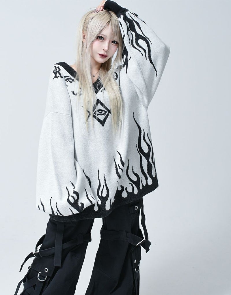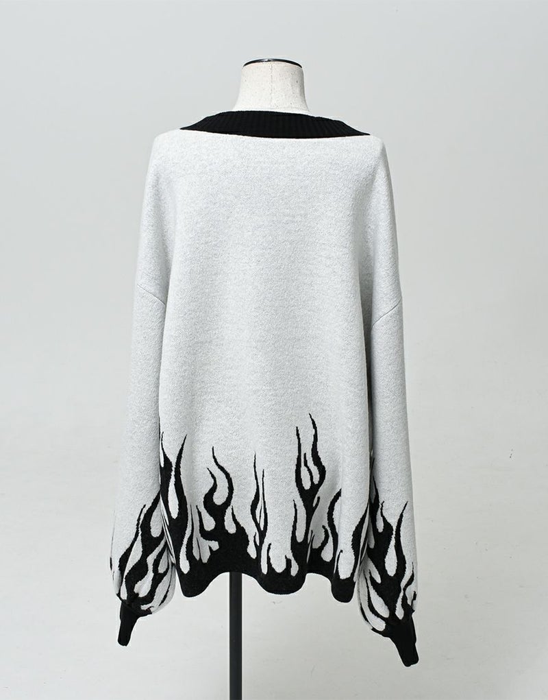 Vネックに沿うようにロゴとモチーフを入れ、裾・袖口上にファイヤーパターンを入れたプルオーバーニットです。