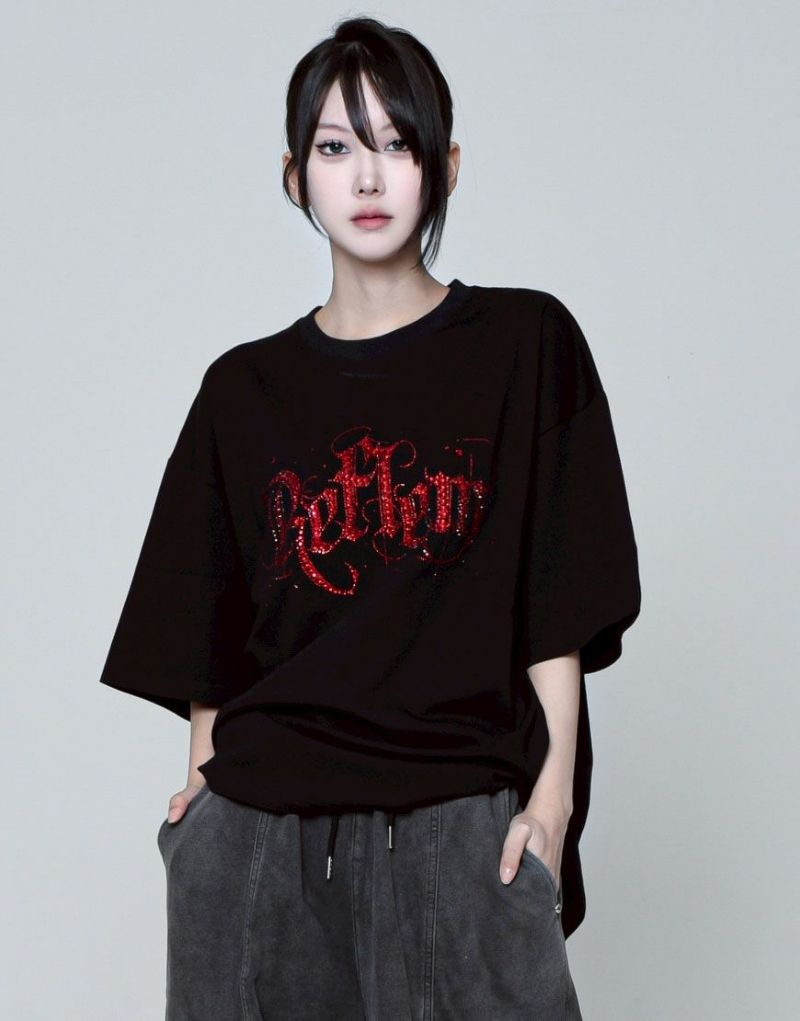 大小さまざまなラインストーンと使用してロゴをデザインの半袖トップスです。