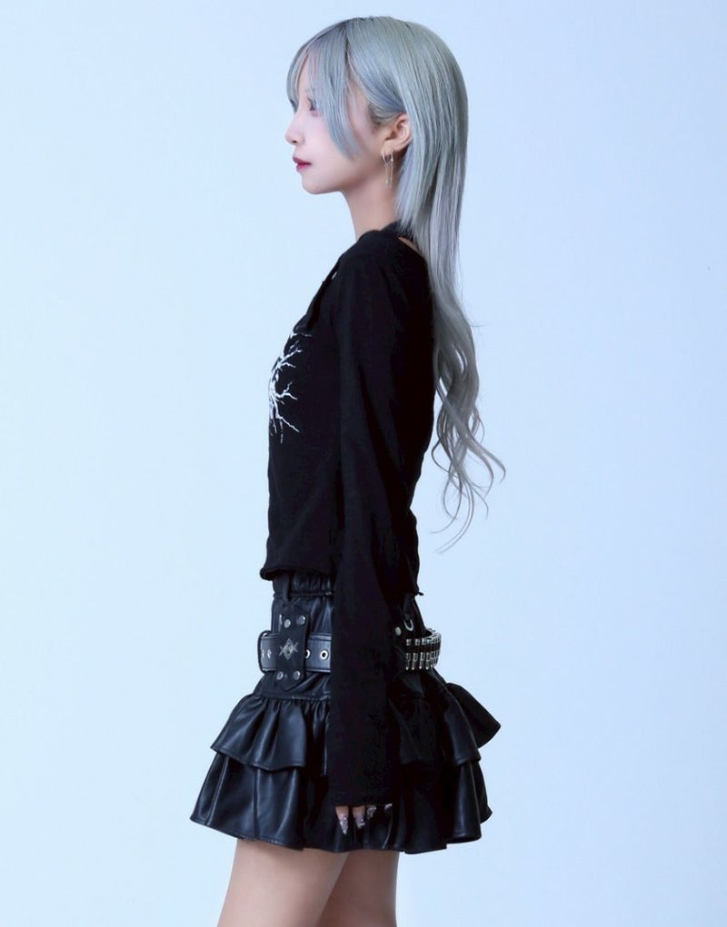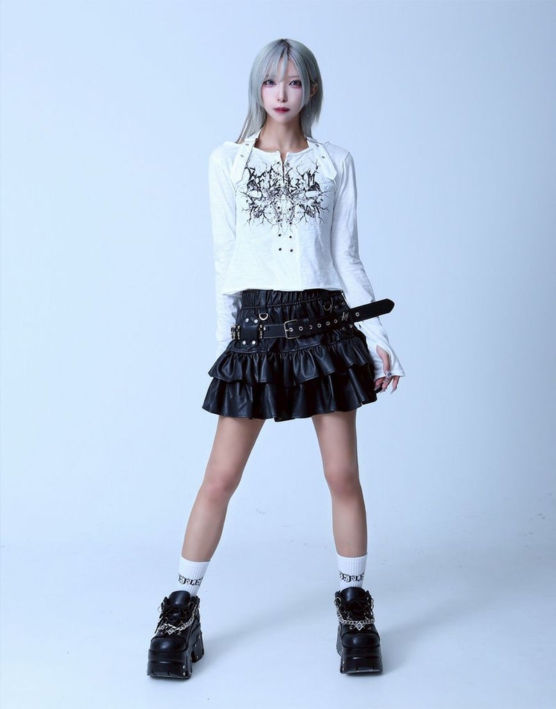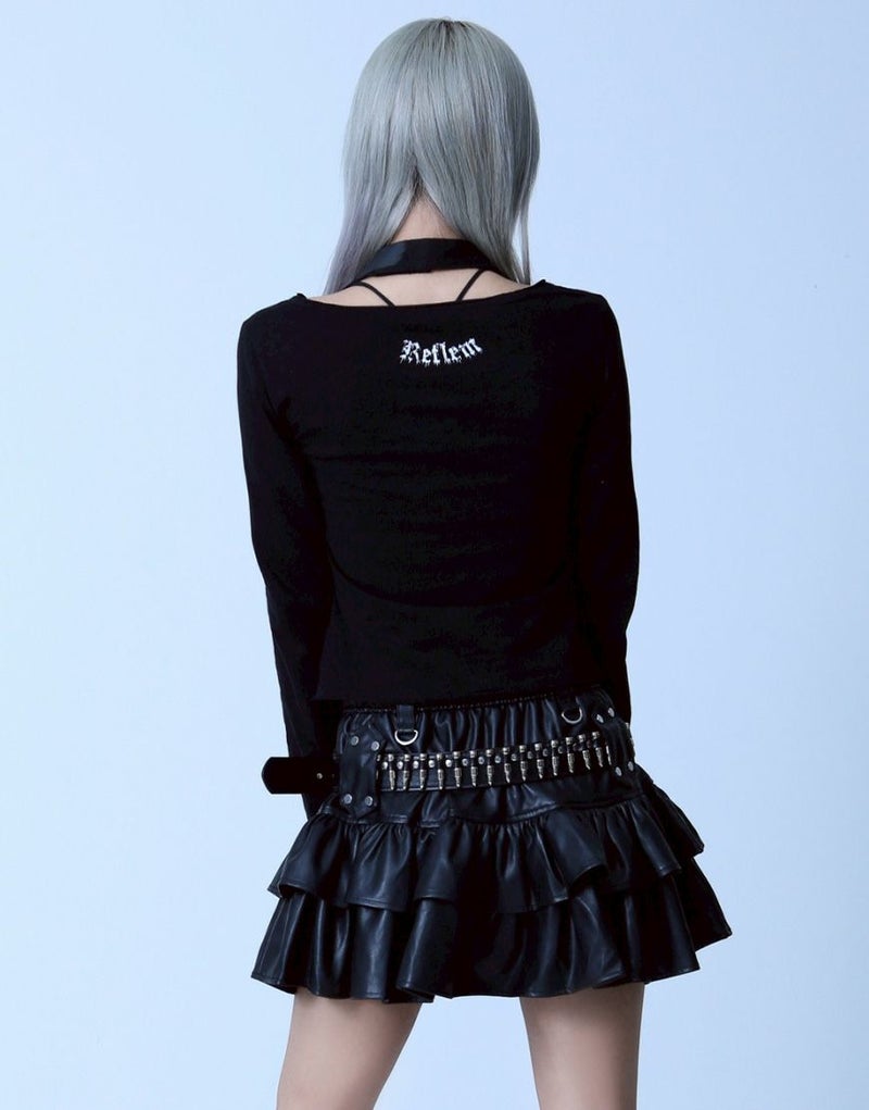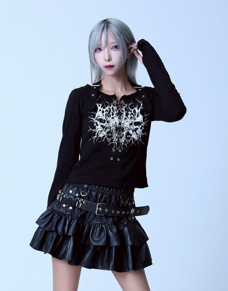 首元のホルターストラップがアクセントになり、モードな印象とストリートエッセンスを融合させた一枚です。