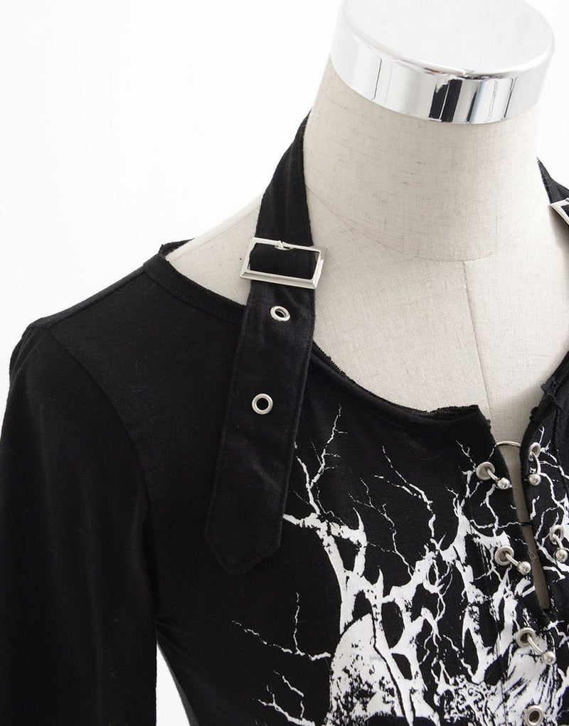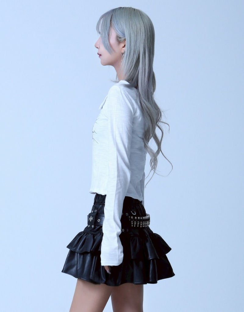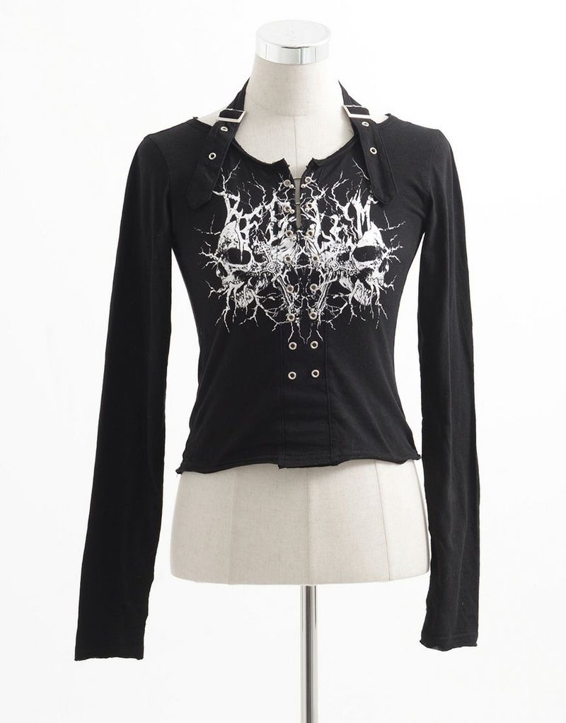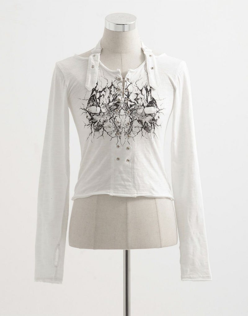 首元のホルターストラップがアクセントになり、モードな印象とストリートエッセンスを融合させた一枚です。
