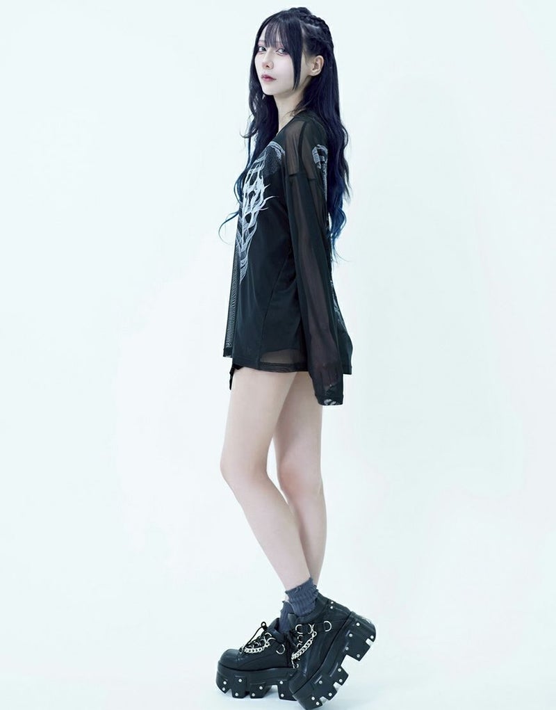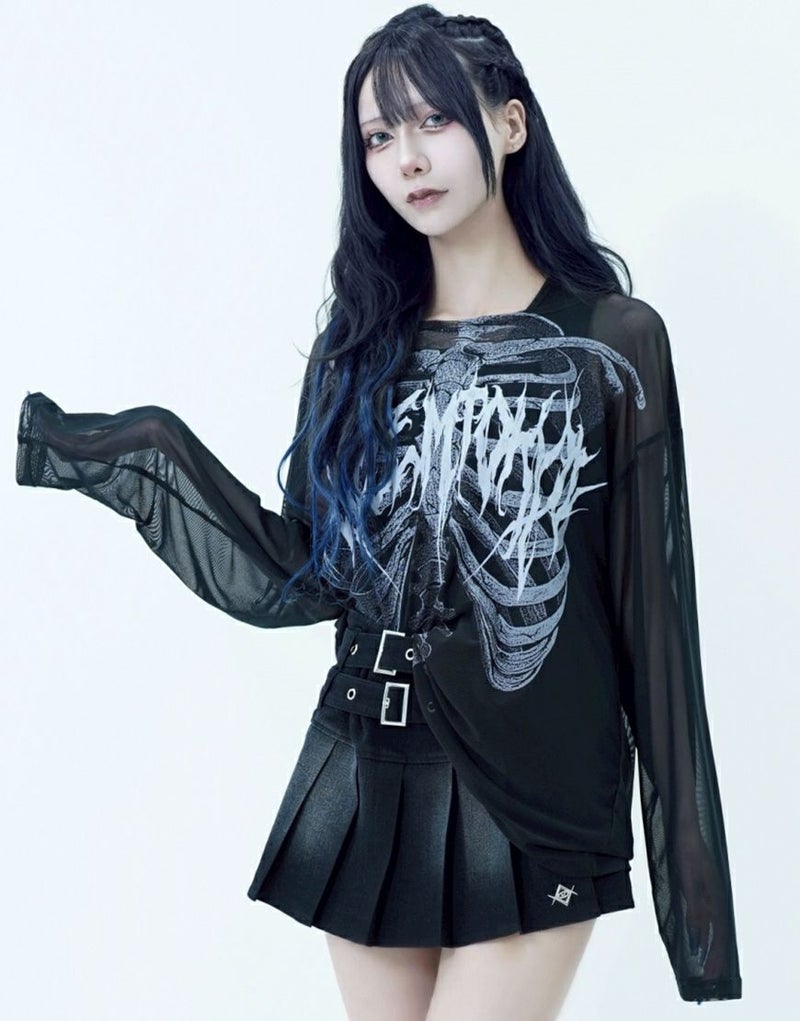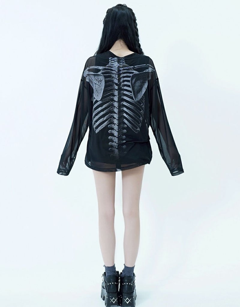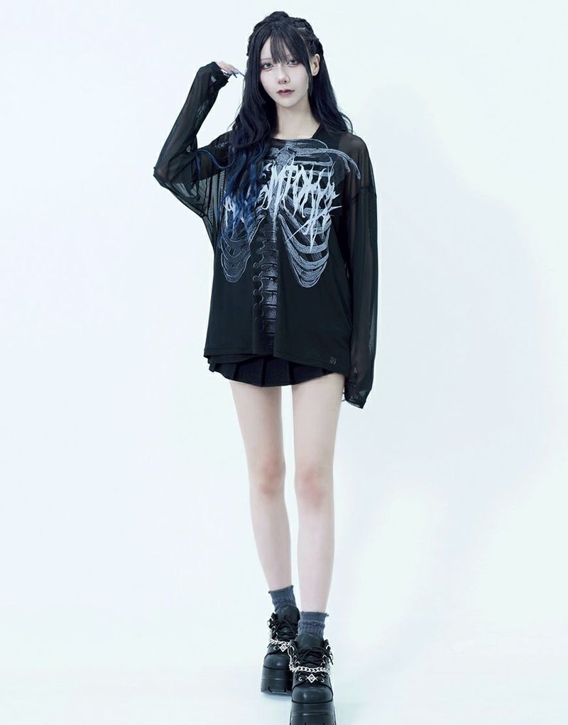 メッシュトップスはフロントとバックにスケルトングラフィックを大胆にプリントし、インナーとのレイヤードで存在感を発揮します。